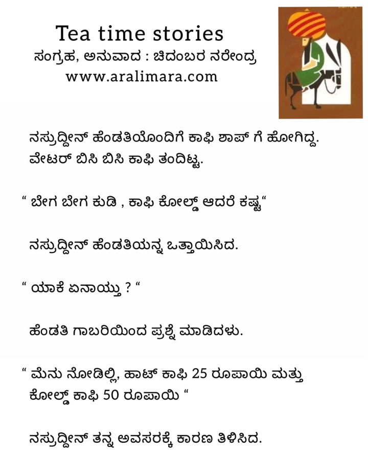 ನಸ್ರುದ್ದೀನನ ಕಾಫಿ ಕಥೆ: tea time story ಅಕ್ಟೋಬರ್ 4, 2021 By ಅರಳಿ ಮರ Share this:Tweet Click to email a link to a friend (Opens in new window) Email Click to share on Telegram (Opens in new window) Telegram Click to share on WhatsApp (Opens in new window) WhatsApp ಇನ್ನಷ್ಟು Click to print (Opens in new window) Print Click to share on Reddit (Opens in new window) Reddit Share on TumblrLike ಲೋಡ್ ಆಗುತ್ತಿದೆ... Related About ಅರಳಿ ಮರ ಆಧ್ಯಾತ್ಮ, ವ್ಯಕ್ತಿತ್ವ ವಿಕಸನ ಮತ್ತು ಜೀವನ ಶೈಲಿ