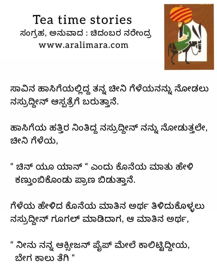 ಚೀನೀ ಗೆಳೆಯ ಹೇಳಿದ್ದೇನು!? : tea time story ಅಕ್ಟೋಬರ್ 7, 2021 By ಅರಳಿ ಮರ Share this:Tweet Click to email a link to a friend (Opens in new window) Email Click to share on Telegram (Opens in new window) Telegram Click to share on WhatsApp (Opens in new window) WhatsApp ಇನ್ನಷ್ಟು Click to print (Opens in new window) Print Click to share on Reddit (Opens in new window) Reddit Share on TumblrLike ಲೋಡ್ ಆಗುತ್ತಿದೆ... Related About ಅರಳಿ ಮರ ಆಧ್ಯಾತ್ಮ, ವ್ಯಕ್ತಿತ್ವ ವಿಕಸನ ಮತ್ತು ಜೀವನ ಶೈಲಿ