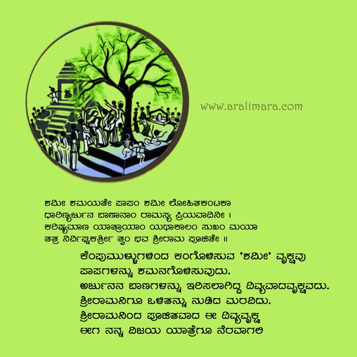 ಅರ್ಥ: ಕೆಂಪು ಮುಳ್ಳುಗಳಿಂದ ಕಂಗೊಳಿಸುವ ‘ಶಮೀ’ ವೃಕ್ಷವು ಪಾಪಗಳನ್ನು ಶಮನಗೊಳಿಸುವುದು. ಅರ್ಜುನನ ಬಾಣಗಳನ್ನು ಇರಿಸಲಾಗಿದ್ದ ದಿವ್ಯವಾದ ವೃಕ್ಷವದು. ಶ್ರೀರಾಮನಿಗೂ ಒಳಿತನ್ನು ನುಡಿದ ಮರವಿದು. ಶ್ರೀರಾಮನಿಂದ ಪೂಜಿತವಾದ ಈ ದಿವ್ಯವೃಕ್ಷ ಈಗ ನನ್ನ ವಿಜಯ ಯಾತ್ರೆಗೂ ನೆರವಾಗಲಿ