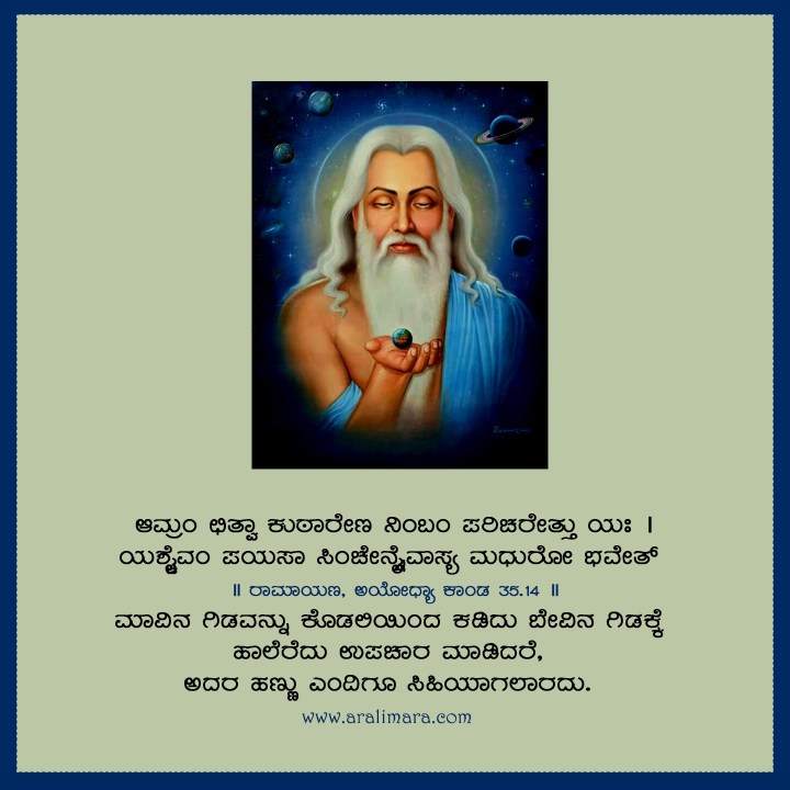 ಆಮ್ರಂ ಛಿತ್ವಾ ಕುಠಾರೇಣ ನಿಂಬಂ ಪರಿಚರೇತ್ತು ಯಃ । ಯಶ್ಚೈವಂ ಪಯಸಾ ಸಿಂಚೇನ್ನೈವಾಸ್ಯ ಮಧುರೋ ಭವೇತ್ ॥ ರಾಮಾಯಣ, ಅಯೋಧ್ಯಾ ಕಾಂಡ 35.14 ॥ ಅರ್ಥ: ಮಾವಿನ ಗಿಡವನ್ನು ಕೊಡಲಿಯಿಂದ ಕಡಿದು ಬೇವಿನ ಗಿಡಕ್ಕೆ ಹಾಲೆರೆದು ಉಪಚಾರ ಮಾಡಿದರೆ, ಅದರ ಹಣ್ಣು ಎಂದಿಗೂ ಸಿಹಿಯಾಗಲಾರದು.