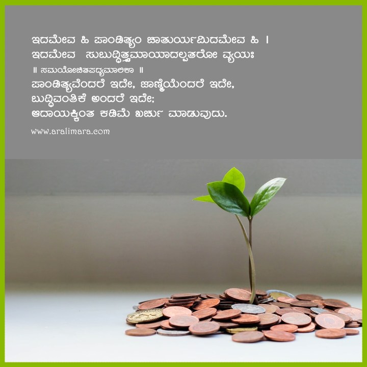 ಇದಮೇವ ಹಿ ಪಾಂಡಿತ್ಯಂ ಚಾತುರ್ಯಮಿದಮೇವ ಹಿ । ಇದಮೇವ ಸುಬುದ್ಧಿತ್ತ್ವಮಾಯಾದಲ್ಪತರೋ ವ್ಯಯಃ ॥ ಸಮಯೋಚಿತಪದ್ಯಮಾಲಿಕಾ ॥ ಅರ್ಥ: ಪಾಂಡಿತ್ಯವೆಂದರೆ ಇದೇ, ಜಾಣ್ಮೆಯೆಂದರೆ ಇದೇ, ಬುದ್ಧಿವಂತಿಕೆ ಅಂದರೆ ಇದೇ – ಆದಾಯಕ್ಕಿಂತ ಕಡಿಮೆ ಖರ್ಚು ಮಾಡುವುದು.