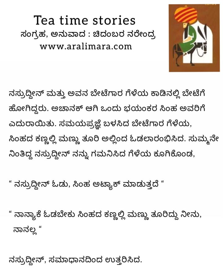 ಸಿಂಹ ಬಂದರೆ ಓಡಬೇಕಾದೋರು ಯಾರು!? : Tea time story ಅಕ್ಟೋಬರ್ 22, 2021 By ಅರಳಿ ಮರ ನಸ್ರುದ್ದೀನನ ಮತ್ತೊಂದು ಚಿಕ್ಕಥೆ 😂 😂 😂 Share this:Tweet Click to email a link to a friend (Opens in new window) Email Click to share on Telegram (Opens in new window) Telegram Click to share on WhatsApp (Opens in new window) WhatsApp ಇನ್ನಷ್ಟು Click to print (Opens in new window) Print Click to share on Reddit (Opens in new window) Reddit Share on TumblrLike ಲೋಡ್ ಆಗುತ್ತಿದೆ... Related About ಅರಳಿ ಮರ ಆಧ್ಯಾತ್ಮ, ವ್ಯಕ್ತಿತ್ವ ವಿಕಸನ ಮತ್ತು ಜೀವನ ಶೈಲಿ