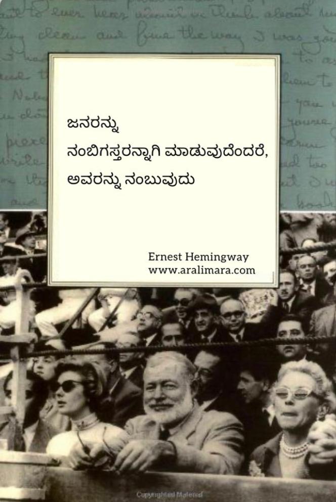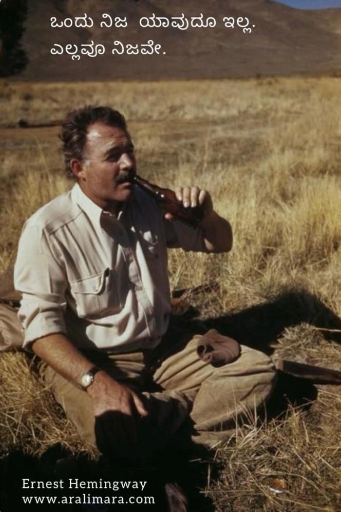 ಅರ್ನೆಸ್ಟ್ ಹೆಮಿಂಗ್ವೇ, ನೊಬೆಲ್ ವಿಜೇತ ಅಮೆರಿಕನ್ ಸಾಹಿತಿ. ಇವರೊಬ್ಬ ಪತ್ರಕರ್ತರೂ ಆಗಿದ್ದು, ತನ್ನ ಹೊಸ ಮಾದರಿಯ ಬರವಣಿಗೆ ಹಾಗೂ ಬದುಕಿನ ಸಾಹಸಶೀಲತೆ ಮುಂದಿನ ತಲೆಮಾರಿನ ಸಾವಿರಾರು ಜನರ ಬರವಣಿಗೆ ಮತ್ತು ಬದುಕಿನಲ್ಲಿ ಪ್ರಭಾವ ಬೀರಿದ ವ್ಯಕ್ತಿ. ಇಂದಿನ ‘ಚಿತ್ರಭಿತ್ತಿಯಲ್ಲಿ’ ಹೆಮಿಂಗ್ವೆ ಅವರ ಕೆಲವು ಹೊಳಹುಗಳು ನಿಮಗಾಗಿ… । ಸಂಗ್ರಹ ಮತ್ತು ಅನುವಾದ: ಚಿದಂಬರ ನರೇಂದ್ರ