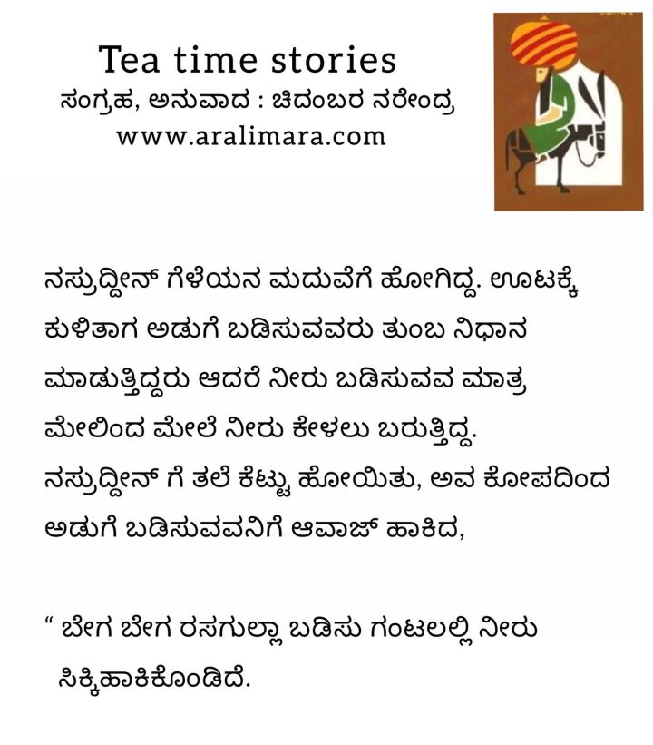 ನಸ್ರುದ್ದೀನನ ಅವಸರ : tea time story ನವೆಂಬರ್ 10, 2021 By ಅರಳಿ ಮರ Share this:Tweet Click to email a link to a friend (Opens in new window) Email Click to share on Telegram (Opens in new window) Telegram Click to share on WhatsApp (Opens in new window) WhatsApp ಇನ್ನಷ್ಟು Click to print (Opens in new window) Print Click to share on Reddit (Opens in new window) Reddit Share on TumblrLike ಲೋಡ್ ಆಗುತ್ತಿದೆ... Related About ಅರಳಿ ಮರ ಆಧ್ಯಾತ್ಮ, ವ್ಯಕ್ತಿತ್ವ ವಿಕಸನ ಮತ್ತು ಜೀವನ ಶೈಲಿ