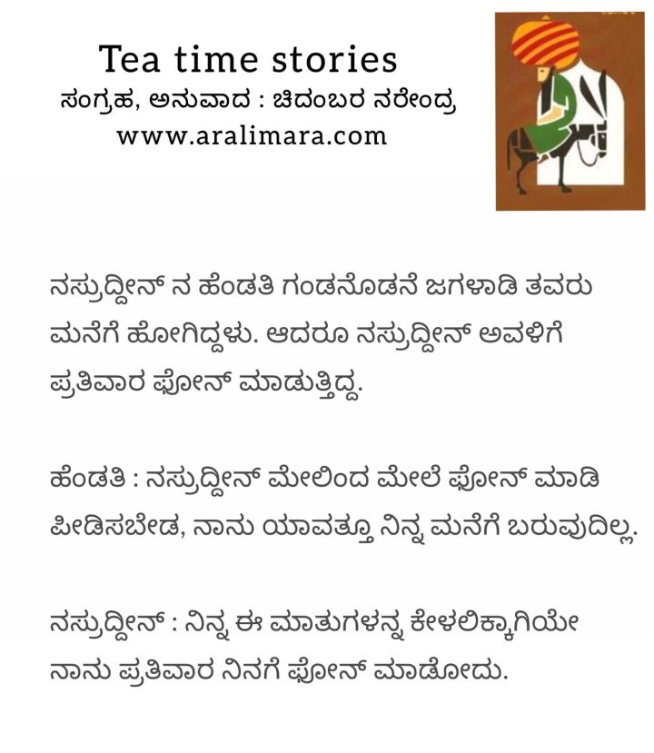 ಫೋನ್ ಮಾಡಲು ಕಾರಣ : tea time story ಡಿಸೆಂಬರ್ 5, 2021 By ಅರಳಿ ಮರ ಜಗಳಾಡಿಕೊಂಡು ತವರು ಸೇರಿದ ಹೆಂಡತಿಗೆ ನಸ್ರುದ್ದೀನ್ ಪದೇ ಪದೇ ಫೋನ್ ಮಾಡಿದ್ಯಾಕೆ !? Share this:Tweet Click to email a link to a friend (Opens in new window) Email Click to share on Telegram (Opens in new window) Telegram Click to share on WhatsApp (Opens in new window) WhatsApp ಇನ್ನಷ್ಟು Click to print (Opens in new window) Print Click to share on Reddit (Opens in new window) Reddit Share on TumblrLike ಲೋಡ್ ಆಗುತ್ತಿದೆ... Related About ಅರಳಿ ಮರ ಆಧ್ಯಾತ್ಮ, ವ್ಯಕ್ತಿತ್ವ ವಿಕಸನ ಮತ್ತು ಜೀವನ ಶೈಲಿ