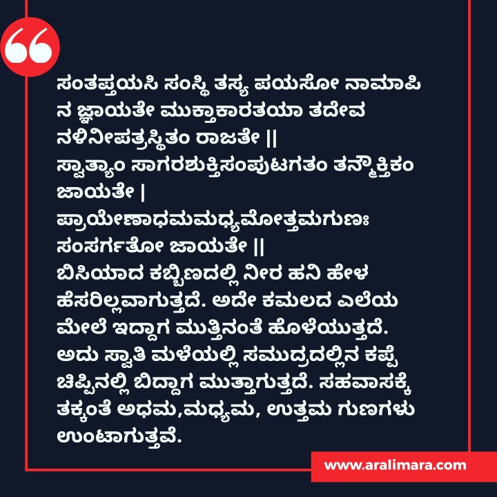 ತಾತ್ಪರ್ಯ: ಚೆನ್ನಾಗಿ ಕಾದ ಕಬ್ಬಿಣದ ಮೇಲೆ ಬಿದ್ದ ನೀರಿನ ಹನಿಯು ಕುರುಹೂ ಇಲ್ಲದಂತೆ ನಾಶವಾಗುತ್ತದೆ. ಅದೇ ಹನಿ ಕಮಲದ ಎಲೆಯ ಮೇಲೆ ಬಿದ್ದಾಗ ಮುತ್ತಿನಂತೆ ಹೊಳೆಯುತ್ತದೆ. ಅದು ಸ್ವಾತಿಮಳೆಯಲ್ಲಿ ಸಮುದ್ರದಲ್ಲಿನ ಕಪ್ಪೆ ಚಿಪ್ಪಿನ ಮೇಲೆ ಬಿದ್ದಿದ್ದೇ ಆದರೆ ಮುತ್ತೇ ಆಗಿಬಿಡುತ್ತದೆ. ಆದ್ದರಿಂದ ಬಹುತೇಕ ನಮ್ಮ ಅಧಮ,ಮಧ್ಯಮ, ಉತ್ತಮ ಗುಣಗಳು ಸಹವಾಸದಿಂದ ಉಂಟಾಗುತ್ತವೆ. ಸಹವಾಸ ಮಾಡುವಾಗ ಎಚ್ಚರಿಕೆಯಿಂದ ಆಯ್ಕೆ ಮಾಡಿಕೊಳ್ಳಬೇಕು.
