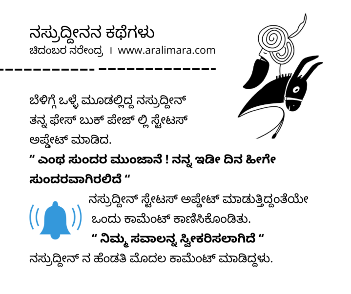 ನಸ್ರುದ್ದೀನನ FB ಸವಾಲು : Tea time stories ಏಪ್ರಿಲ್ 17, 2022 By ಅರಳಿ ಮರ Share this:Tweet Click to email a link to a friend (Opens in new window) Email Click to share on Telegram (Opens in new window) Telegram Click to share on WhatsApp (Opens in new window) WhatsApp ಇನ್ನಷ್ಟು Click to print (Opens in new window) Print Click to share on Reddit (Opens in new window) Reddit Share on TumblrLike ಲೋಡ್ ಆಗುತ್ತಿದೆ... Related About ಅರಳಿ ಮರ ಆಧ್ಯಾತ್ಮ, ವ್ಯಕ್ತಿತ್ವ ವಿಕಸನ ಮತ್ತು ಜೀವನ ಶೈಲಿ