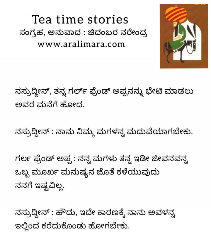 ನಸ್ರುದ್ದೀನ್ ಕೊಟ್ಟ ಕಾರಣ! : Tea time story ಮೇ 7, 2022 By ಅರಳಿ ಮರ ಹುಡುಗಿಯನ್ನು ಮದುವೆಯಾಗಲು ನಸ್ರುದ್ದೀನ್, ಅವಳ ಅಪ್ಪನಿಗೆ ಕೊಟ್ಟ ಕಾರಣವೇನು ಗೊತ್ತಾ!? Share this:Tweet Click to email a link to a friend (Opens in new window) Email Click to share on Telegram (Opens in new window) Telegram Click to share on WhatsApp (Opens in new window) WhatsApp ಇನ್ನಷ್ಟು Click to print (Opens in new window) Print Click to share on Reddit (Opens in new window) Reddit Share on TumblrLike ಲೋಡ್ ಆಗುತ್ತಿದೆ... Related About ಅರಳಿ ಮರ ಆಧ್ಯಾತ್ಮ, ವ್ಯಕ್ತಿತ್ವ ವಿಕಸನ ಮತ್ತು ಜೀವನ ಶೈಲಿ
