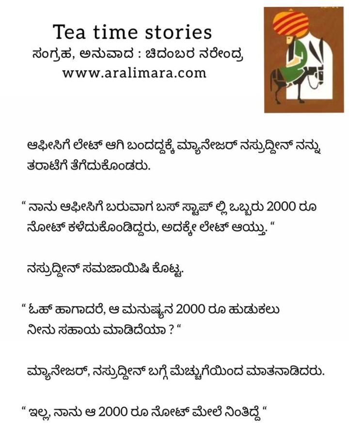 ನಸ್ರುದ್ದೀನ್ ಕೊಟ್ಟ ಕಾರಣ! : Tea time story ಮೇ 25, 2022 By ಅರಳಿ ಮರ Share this:Tweet Click to email a link to a friend (Opens in new window) Email Click to share on Telegram (Opens in new window) Telegram Click to share on WhatsApp (Opens in new window) WhatsApp ಇನ್ನಷ್ಟು Click to print (Opens in new window) Print Click to share on Reddit (Opens in new window) Reddit Share on TumblrLike ಲೋಡ್ ಆಗುತ್ತಿದೆ... Related About ಅರಳಿ ಮರ ಆಧ್ಯಾತ್ಮ, ವ್ಯಕ್ತಿತ್ವ ವಿಕಸನ ಮತ್ತು ಜೀವನ ಶೈಲಿ