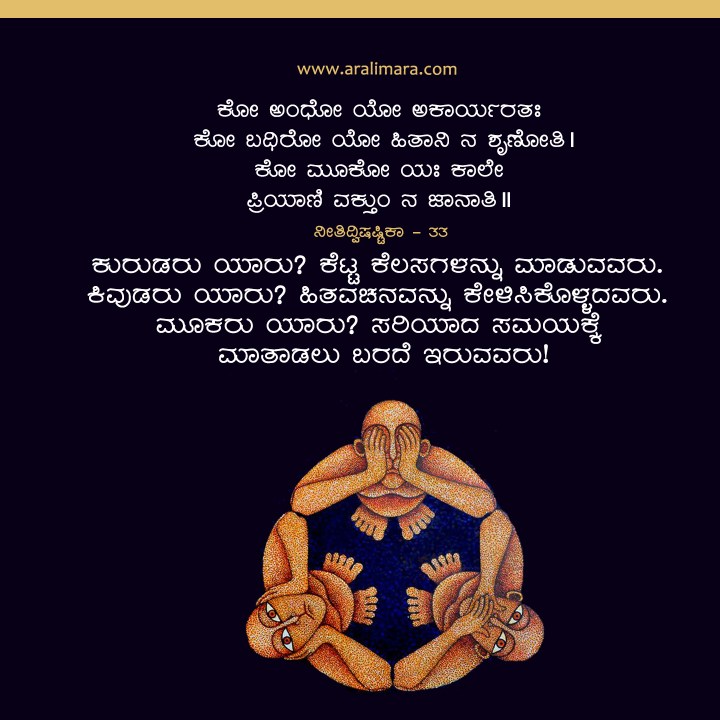 ಅರ್ಥ: ಕುರುಡರು ಯಾರು? ಕೆಟ್ಟ ಕೆಲಸಗಳನ್ನು ಮಾಡುವವರು. ಕಿವುಡರು ಯಾರು? ಹಿತವಚನವನ್ನು ಕೇಳಿಸಿಕೊಳ್ಳದವರು. ಮೂಕರು ಯಾರು? ಸರಿಯಾದ ಸಮಯಕ್ಕೆ ಮಾತಾಡಲು ಬರದೆ ಇರುವವರು!