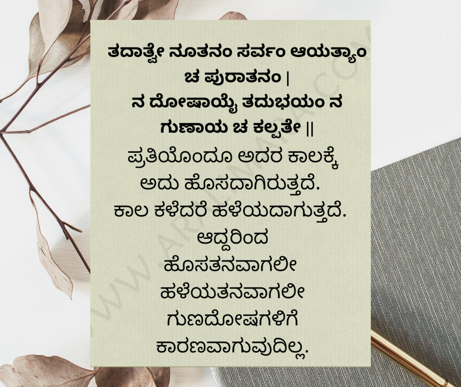 ಹಳತೆಲ್ಲವೂ ಶ್ರೇಷ್ಠ, ಹೊಸತೆಲ್ಲವೂ ಅಳ್ಳಕ ಅನ್ನುವ ವ್ಯಸನವಾಗಲೀ; ಹಳತೆಲ್ಲವೂ ತುಚ್ಛ, ಹೊಸತೆಲ್ಲವೂ ಉಚ್ಚ ಅನ್ನುವ ತಾತ್ಸಾರವಾಗಲೀ ಸಲ್ಲದು ಅನ್ನುತ್ತದೆ ಈ ಸುಭಾಷಿತ । ಸಾ.ಹಿರಣ್ಮಯೀ
