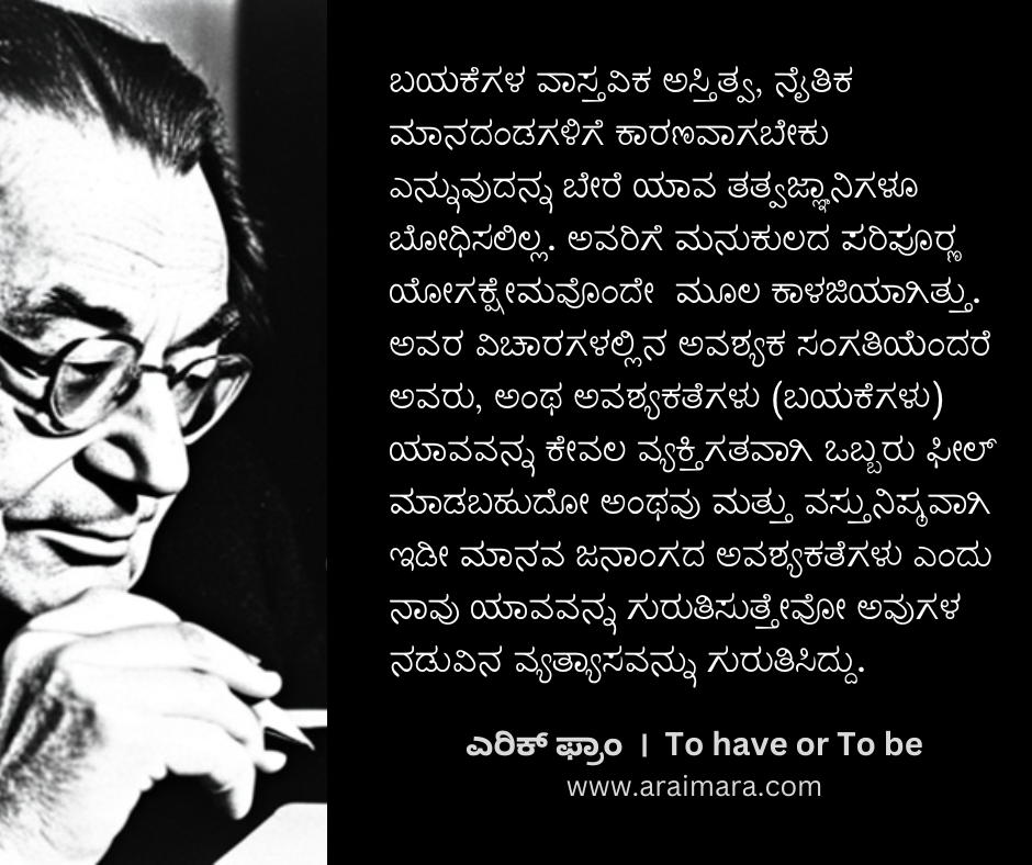 (ಎರಿಕ್ ಫ್ರಾಂ ಬಹುಚರ್ಚಿತ ಕೃತಿ To have or To Be ಇನ್ನು ಕನ್ನಡದಲ್ಲಿ ಪ್ರತಿ ಶನಿವಾರ ಮತ್ತು ಭಾನುವಾರ ಸರಣಿಯಾಗಿ ಅರಳಿಮರದಲ್ಲಿ ಪ್ರಕಟಗೊಳ್ಳಲಿದೆ. ಫ್ರಾಂ ಅವರ “The art of Loving” ಅನುವಾದ ಮಾಡಿದ್ದ ಚಿದಂಬರ ನರೇಂದ್ರ ಅವರು ಅರಳಿಮರ ಓದುಗರಿಗಾಗಿ ಈ ಸರಣಿಯನ್ನು ಅನುವಾದಿಸುತ್ತಿದ್ದಾರೆ. )