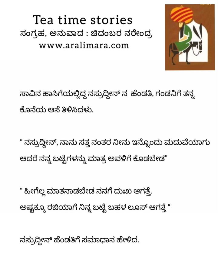 ನಸ್ರುದ್ದೀನನ ಸಮಾಧಾನ : tea time story ಮಾರ್ಚ್ 18, 2023 By ಅರಳಿ ಮರ Share this:Tweet Click to email a link to a friend (Opens in new window) Email Click to share on Telegram (Opens in new window) Telegram Click to share on WhatsApp (Opens in new window) WhatsApp ಇನ್ನಷ್ಟು Click to print (Opens in new window) Print Click to share on Reddit (Opens in new window) Reddit Share on TumblrLike ಲೋಡ್ ಆಗುತ್ತಿದೆ... Related About ಅರಳಿ ಮರ ಆಧ್ಯಾತ್ಮ, ವ್ಯಕ್ತಿತ್ವ ವಿಕಸನ ಮತ್ತು ಜೀವನ ಶೈಲಿ