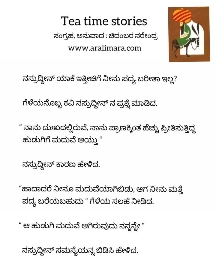 ನಸ್ರುದ್ದೀನ್ ಪದ್ಯ ಬರೆಯೋದು ನಿಲ್ಲಿಸಿದ್ಯಾಕೆ ಗೊತ್ತಾ? : Tea time story ಮಾರ್ಚ್ 24, 2023 By ಅರಳಿ ಮರ Share this:Tweet Email a link to a friend (Opens in new window) Email Share on Telegram (Opens in new window) Telegram Share on WhatsApp (Opens in new window) WhatsApp ಇನ್ನಷ್ಟು ಮುದ್ರಿಸಿ (Opens in new window) Print Share on Reddit (Opens in new window) Reddit Share on TumblrLike ಲೋಡ್ ಆಗುತ್ತಿದೆ... Related About ಅರಳಿ ಮರ ಆಧ್ಯಾತ್ಮ, ವ್ಯಕ್ತಿತ್ವ ವಿಕಸನ ಮತ್ತು ಜೀವನ ಶೈಲಿ