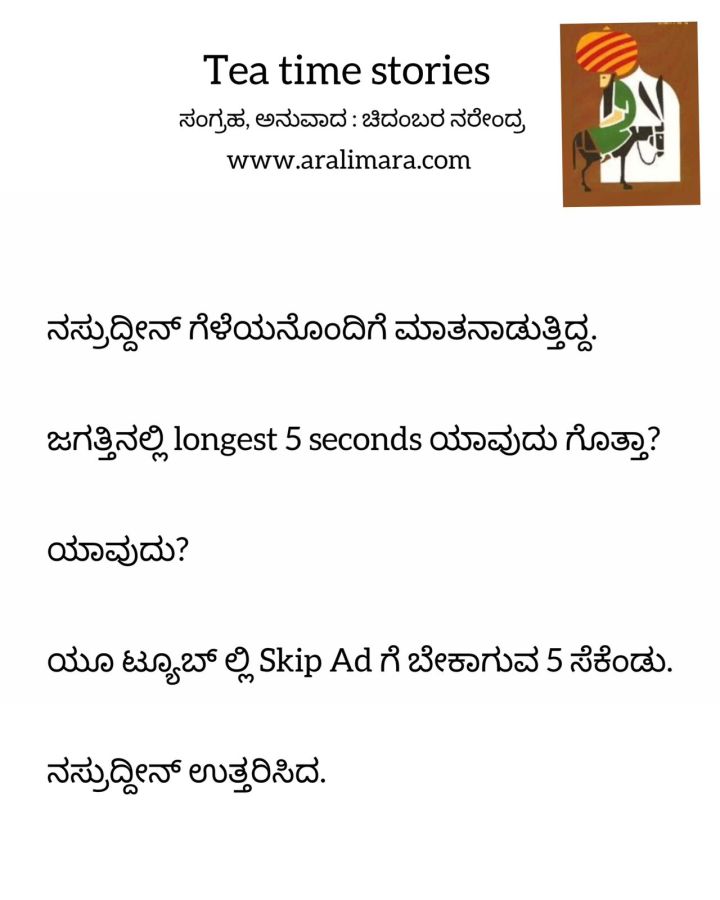 ಆ ಐದು ಸೆಕೆಂಡ್! : Tea time story ಏಪ್ರಿಲ್ 10, 2023 By ಅರಳಿ ಮರ Share this:Tweet Click to email a link to a friend (Opens in new window) Email Click to share on Telegram (Opens in new window) Telegram Click to share on WhatsApp (Opens in new window) WhatsApp ಇನ್ನಷ್ಟು Click to print (Opens in new window) Print Click to share on Reddit (Opens in new window) Reddit Share on TumblrLike ಲೋಡ್ ಆಗುತ್ತಿದೆ... Related About ಅರಳಿ ಮರ ಆಧ್ಯಾತ್ಮ, ವ್ಯಕ್ತಿತ್ವ ವಿಕಸನ ಮತ್ತು ಜೀವನ ಶೈಲಿ