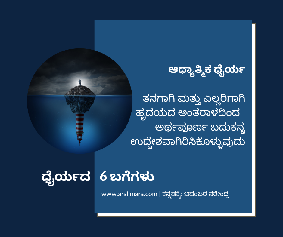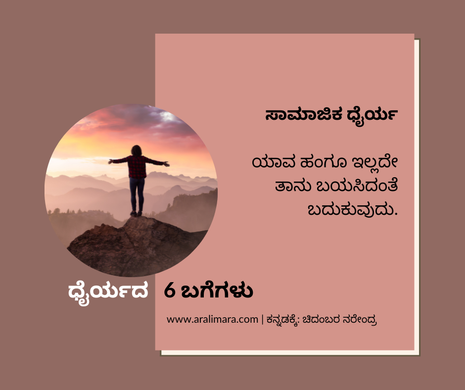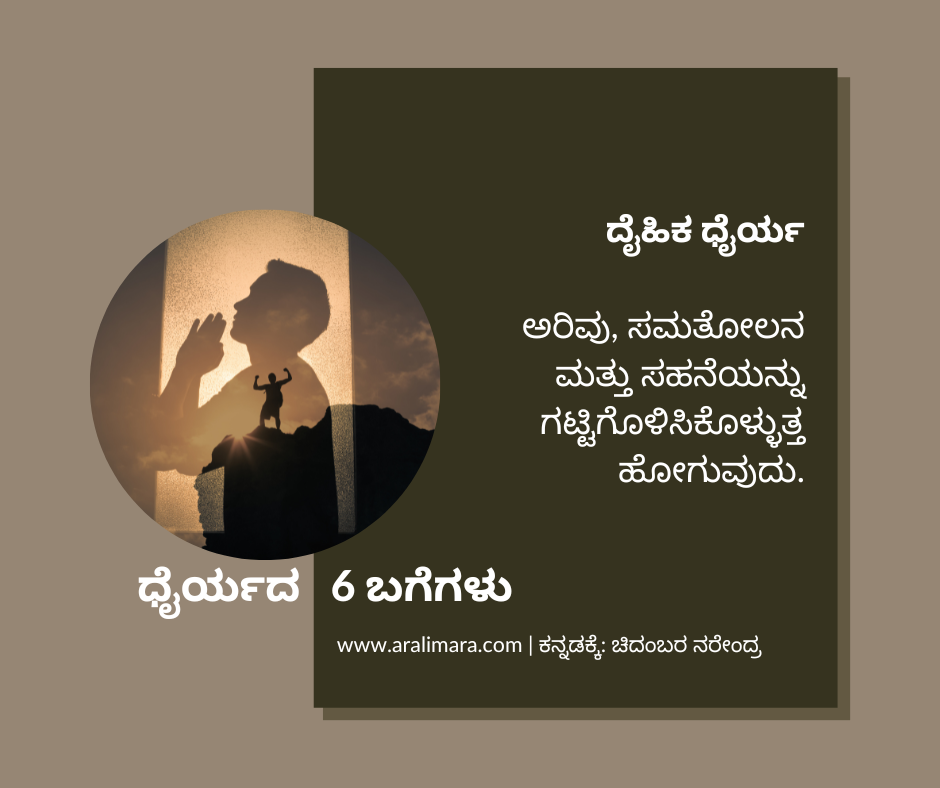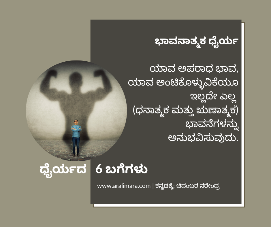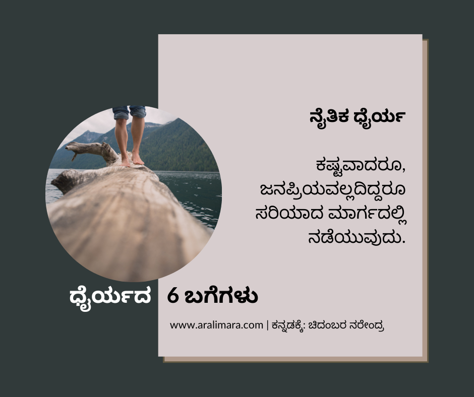 ಧೈರ್ಯ ಅಂದರೆ ಧಾರಣ ಶಕ್ತಿ. ದೈಹಿಕ, ನೈತಿಕ, ಭಾವನಾತ್ಮಕ, ಸಾಮಾಜಿಕ, ಬೌದ್ಧಿಕ ಹಾಗೂ ಆಧ್ಯಾತ್ಮಿಕ ಧಾರಣ ಶಕ್ತಿಗಳು ಪ್ರಜ್ಞಾಪೂರ್ವಕವಾಗಿ ಬದುಕಲು ಸಹಾಯ ಮಾಡುತ್ತವೆ. ಈ 6 ಬಗೆಯ ಧೈರ್ಯಗಳ ಕಿರುವಿವರ ಈ ಚಿತ್ರಿಕೆಗಳಲ್ಲಿವೆ… । ಚಿದಂಬರ ನರೇಂದ್ರ