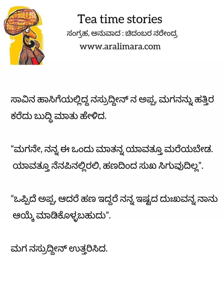 ಹಣದಿಂದ ಸುಖ ಸಿಗದಿದ್ದರೂ… : Tea time Story ಫೆಬ್ರವರಿ 22, 2024 By ಅರಳಿ ಮರ Share this:Tweet Email a link to a friend (Opens in new window) Email Share on Telegram (Opens in new window) Telegram Share on WhatsApp (Opens in new window) WhatsApp ಇನ್ನಷ್ಟು ಮುದ್ರಿಸಿ (Opens in new window) Print Share on Reddit (Opens in new window) Reddit Share on TumblrLike ಲೋಡ್ ಆಗುತ್ತಿದೆ... Related About ಅರಳಿ ಮರ ಆಧ್ಯಾತ್ಮ, ವ್ಯಕ್ತಿತ್ವ ವಿಕಸನ ಮತ್ತು ಜೀವನ ಶೈಲಿ