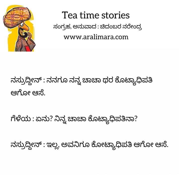 ಚಾಚಾ ಥರ! : Tea time story ಮೇ 15, 2024 By ಅರಳಿ ಮರ Share this:Tweet Click to email a link to a friend (Opens in new window) Email Click to share on Telegram (Opens in new window) Telegram Click to share on WhatsApp (Opens in new window) WhatsApp ಇನ್ನಷ್ಟು Click to print (Opens in new window) Print Click to share on Reddit (Opens in new window) Reddit Share on TumblrLike ಲೋಡ್ ಆಗುತ್ತಿದೆ... Related About ಅರಳಿ ಮರ ಆಧ್ಯಾತ್ಮ, ವ್ಯಕ್ತಿತ್ವ ವಿಕಸನ ಮತ್ತು ಜೀವನ ಶೈಲಿ