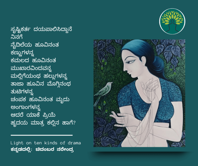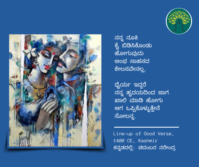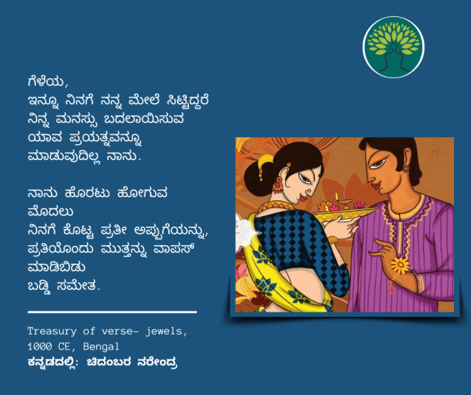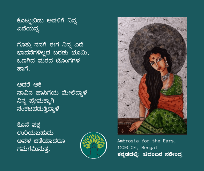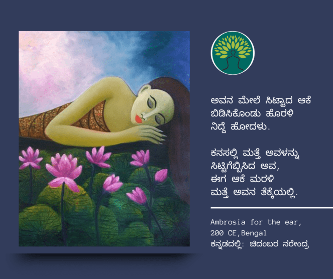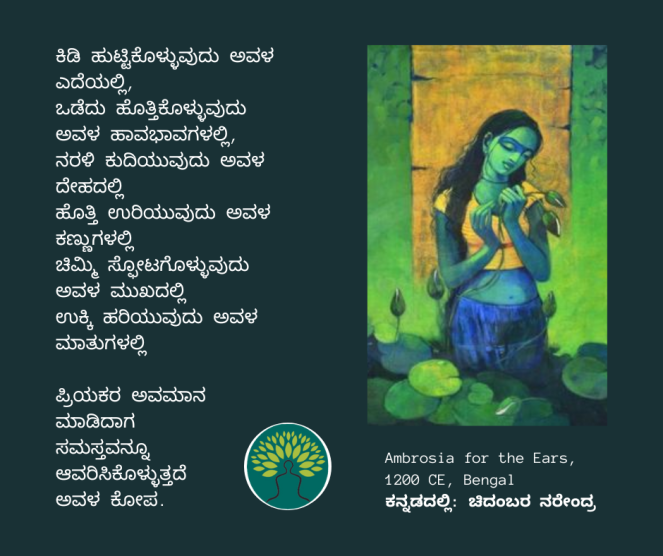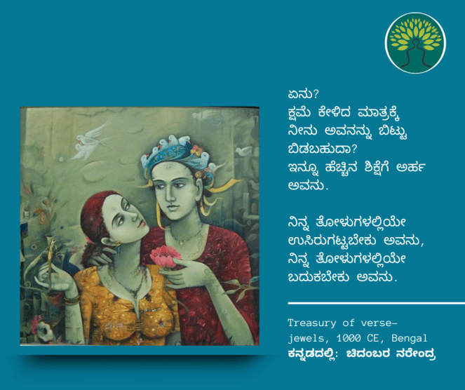 ಸಂಸ್ಕೃತದ ಅಗಾಧ ಪ್ರೇಮಕಾವ್ಯದ ಸಾಗರದಿಂದ ಹೆಕ್ಕಲಾದ ಸುಂದರ ಸಾಲುಗಳ ಗುಚ್ಛವೊಂದು ಇಂಗ್ಲೀಶಿನಲ್ಲಿ ಪುಸ್ತಕವಾಗಿದೆ. ಈ ಪುಸ್ತಕದ ಕೆಲವು ಪದ್ಯಗಳನ್ನು ಚಿದಂಬರ ನರೇಂದ್ರ ಅವರು ಕನ್ನಡಕ್ಕೆ ತಂದಿದ್ದಾರೆ. ಅವುಗಳಲ್ಲಿ 12ನೇ ಕಂತು ಇಲ್ಲಿದೆ… । ಆಕರ : How to love in sanskrit; ಕನ್ನಡದಲ್ಲಿ: ಚಿದಂಬರ ನರೇಂದ್ರ