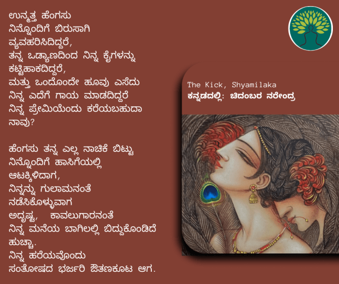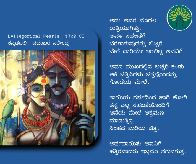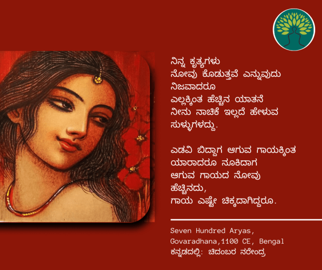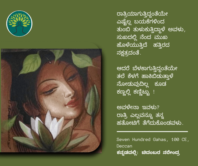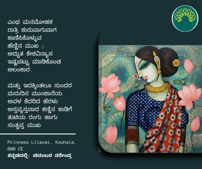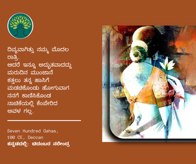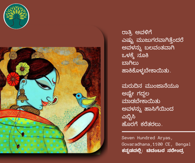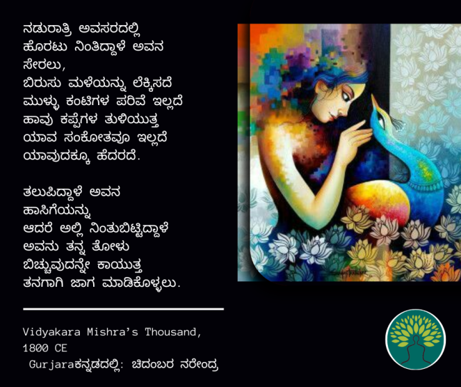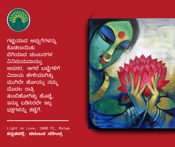 ಸಂಸ್ಕೃತದ ಅಗಾಧ ಪ್ರೇಮಕಾವ್ಯದ ಸಾಗರದಿಂದ ಹೆಕ್ಕಲಾದ ಸುಂದರ ಸಾಲುಗಳ ಗುಚ್ಛವೊಂದು ಇಂಗ್ಲೀಶಿನಲ್ಲಿ ಪುಸ್ತಕವಾಗಿದೆ. ಈ ಪುಸ್ತಕದ ಕೆಲವು ಪದ್ಯಗಳನ್ನು ಚಿದಂಬರ ನರೇಂದ್ರ ಅವರು ಕನ್ನಡಕ್ಕೆ ತಂದಿದ್ದಾರೆ. ಅವುಗಳಲ್ಲಿ 13ನೇ ಕಂತು ಇಲ್ಲಿದೆ… । ಆಕರ : How to love in sanskrit; ಕನ್ನಡದಲ್ಲಿ: ಚಿದಂಬರ ನರೇಂದ್ರ