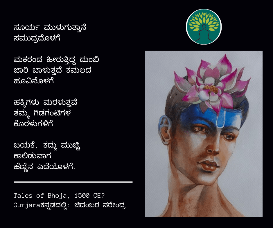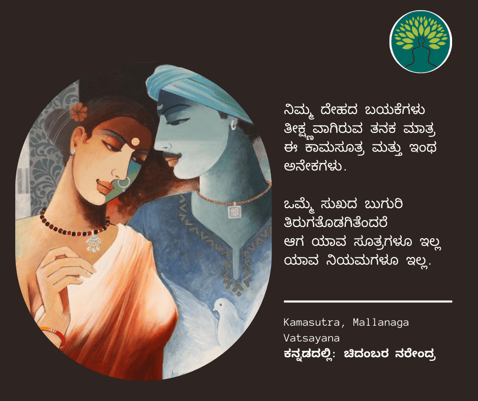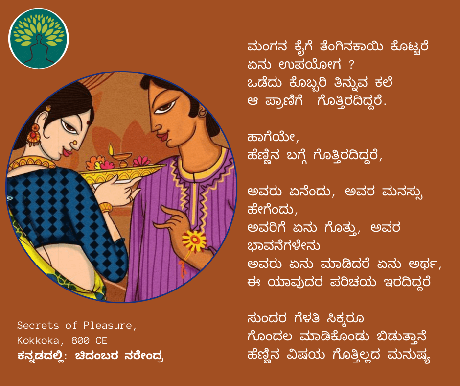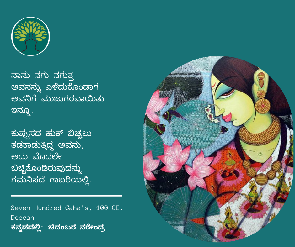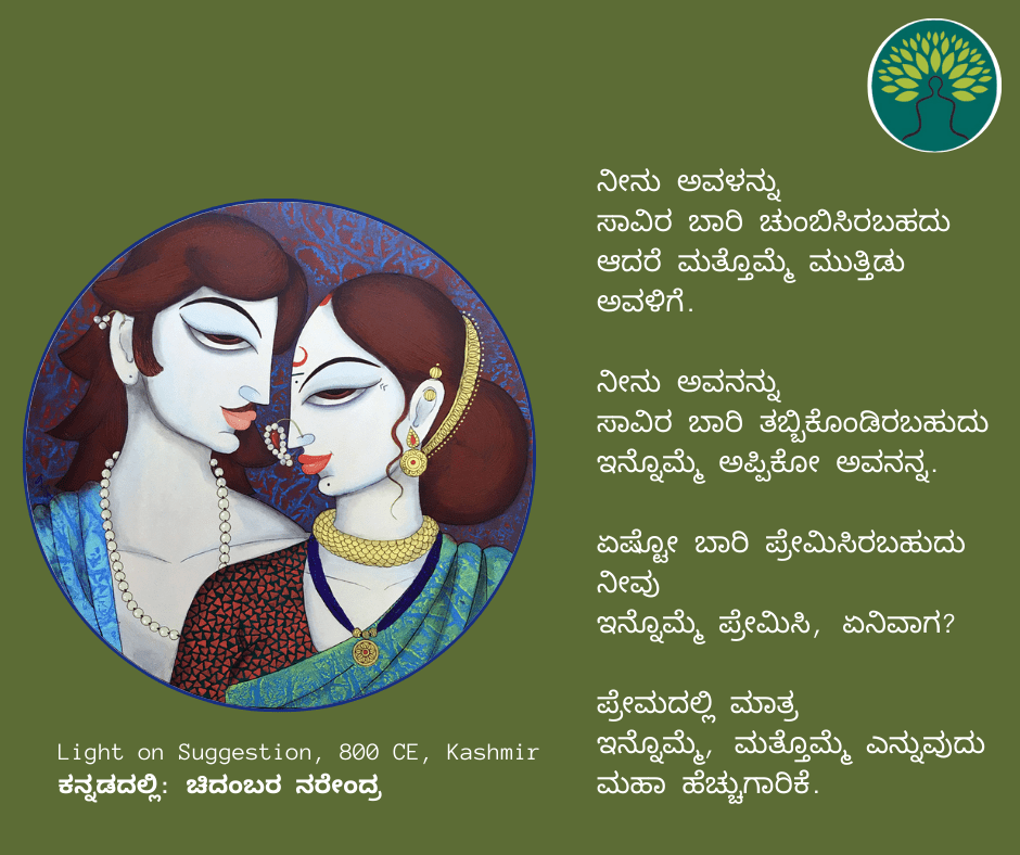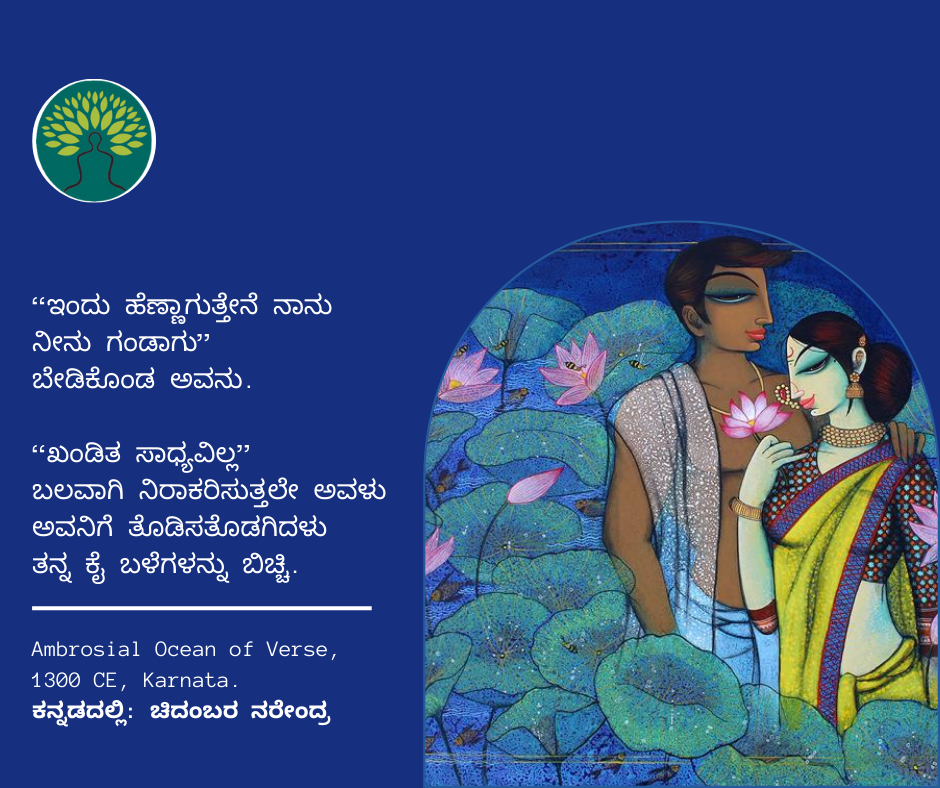 ಸಂಸ್ಕೃತದ ಅಗಾಧ ಪ್ರೇಮಕಾವ್ಯದ ಸಾಗರದಿಂದ ಹೆಕ್ಕಲಾದ ಸುಂದರ ಸಾಲುಗಳ ಗುಚ್ಛವೊಂದು ಇಂಗ್ಲೀಶಿನಲ್ಲಿ ಪುಸ್ತಕವಾಗಿದೆ. ಈ ಪುಸ್ತಕದ ಕೆಲವು ಪದ್ಯಗಳನ್ನು ಚಿದಂಬರ ನರೇಂದ್ರ ಅವರು ಕನ್ನಡಕ್ಕೆ ತಂದಿದ್ದಾರೆ. ಅವುಗಳಲ್ಲಿ 14ನೇ ಕಂತು ಇಲ್ಲಿದೆ… । ಆಕರ : How to love in sanskrit; ಕನ್ನಡದಲ್ಲಿ: ಚಿದಂಬರ ನರೇಂದ್ರ