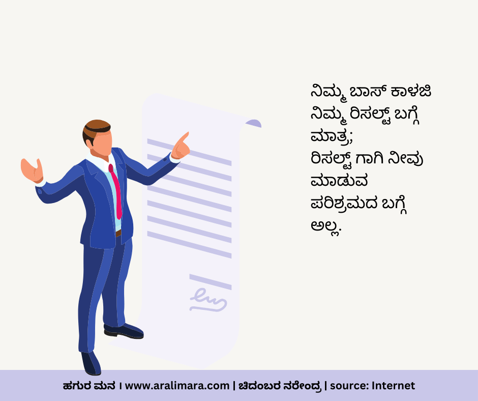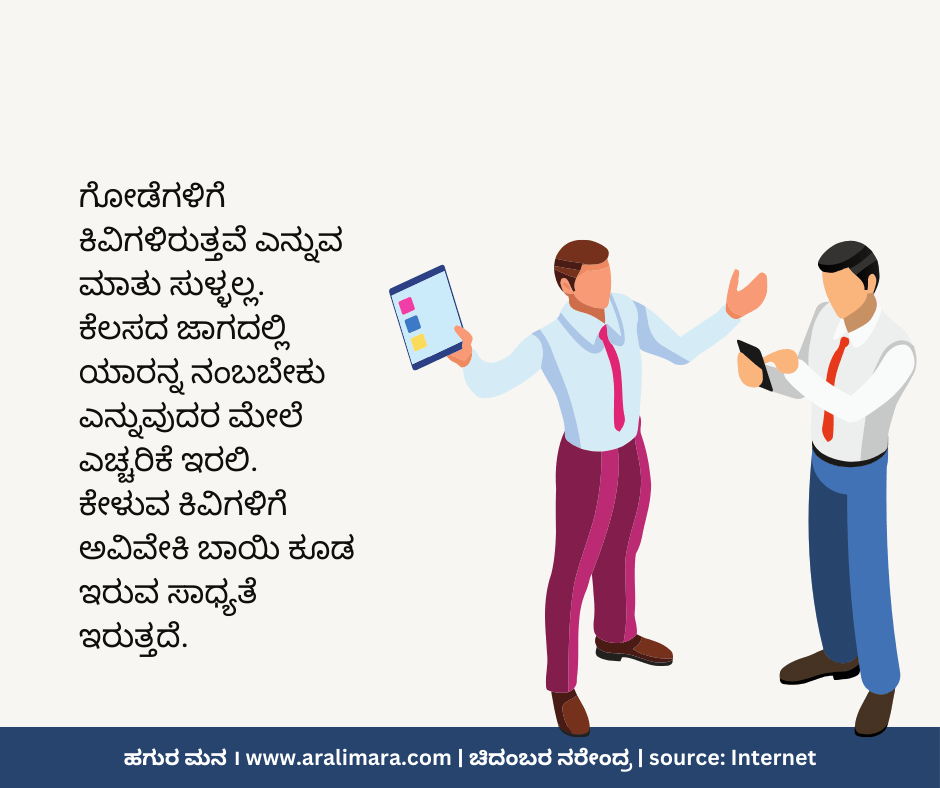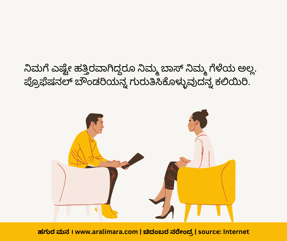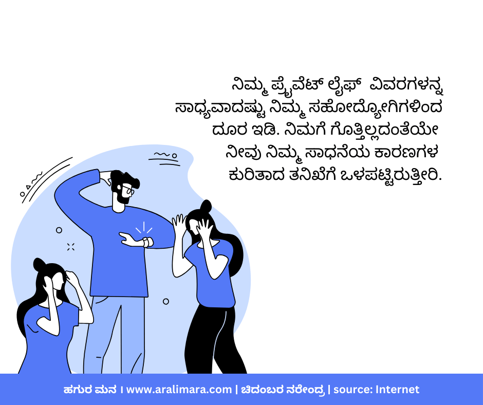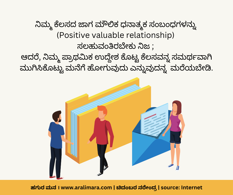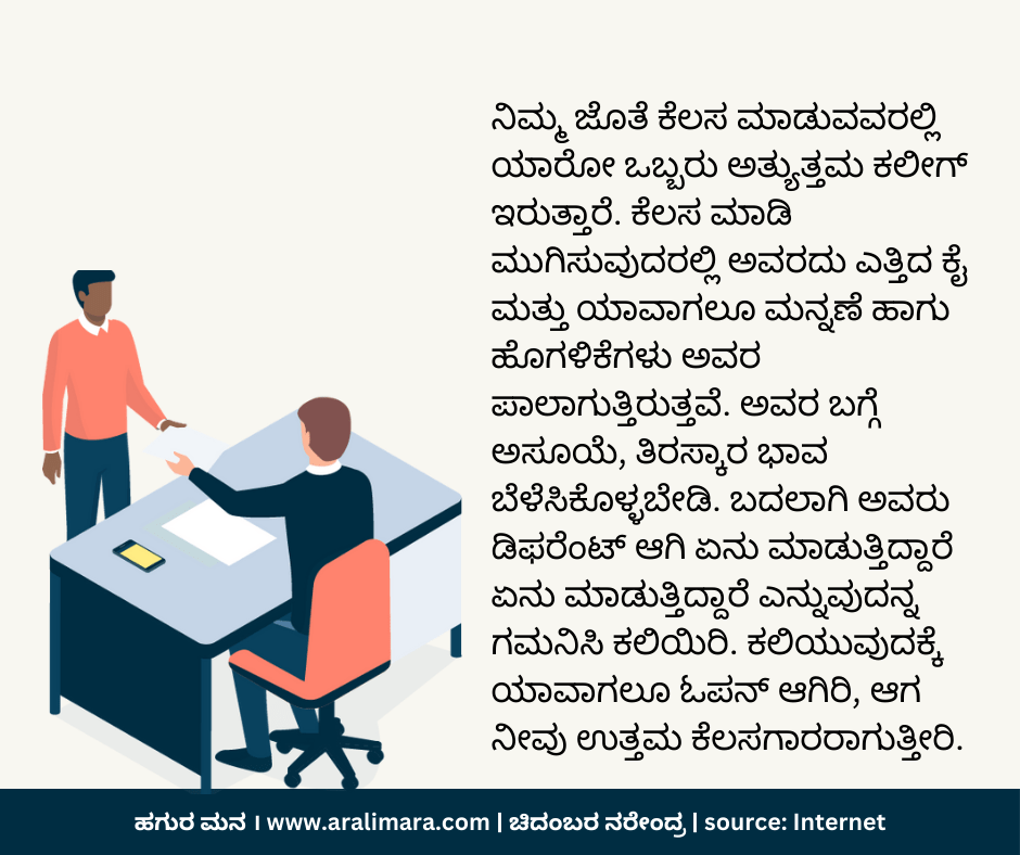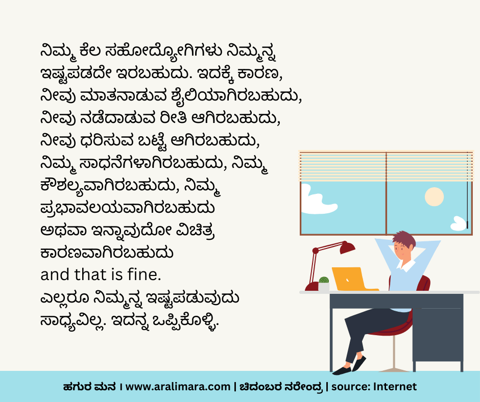 ನಮ್ಮ ದಿನದ, ಬಹುತೇಕ ಜೀವನದ ಬಹುಪಾಲು ಸಮಯ ಉದ್ಯೋಗ ಸ್ಥಳದಲ್ಲೇ ಕಳೆಯುವುದು. ಅಲ್ಲಿಯ ಆಗುಹೋಗುಗಳು ನಮ್ಮ ವ್ಯಕ್ತಿತ್ವದ ಮೇಲೆ, ಮನಸ್ಸಿನ ಮೇಲೆ, ಒಟ್ಟಾರೆ ಬದುಕಿನ ಮೇಲೆ ಪರಿಣಾಮ ಬೀರುವವು. ಆದ್ದರಿಂದ ಉದ್ಯೋಗ ಸ್ಥಳದ ವಾಸ್ತ್ವಗಳನ್ನು ಅರ್ಥ ಮಾಡಿಕೊಂಡು ಸಂಯಮದಿಂದ ನಿಭಾಯಿಸುವುದು ಬಹಳ ಮುಖ್ಯ. ಈ ನಿಟ್ಟಿನಲ್ಲಿ 10 ಸೂತ್ರಗಳು ಇಲ್ಲಿವೆ. । ಸಂಗ್ರಹಾನುವಾದ: ಚಿದಂಬರ ನರೇಂದ್ರ