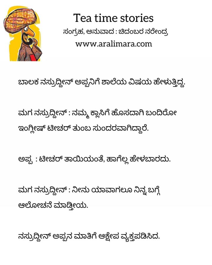 ಅಪ್ಪನಿಗೆ ಅವನದೇ ಚಿಂತೆ! : Tea time story ಜೂನ್ 21, 2024 By ಅರಳಿ ಮರ Share this:Tweet Click to email a link to a friend (Opens in new window) Email Click to share on Telegram (Opens in new window) Telegram Click to share on WhatsApp (Opens in new window) WhatsApp ಇನ್ನಷ್ಟು Click to print (Opens in new window) Print Click to share on Reddit (Opens in new window) Reddit Share on TumblrLike ಲೋಡ್ ಆಗುತ್ತಿದೆ... Related About ಅರಳಿ ಮರ ಆಧ್ಯಾತ್ಮ, ವ್ಯಕ್ತಿತ್ವ ವಿಕಸನ ಮತ್ತು ಜೀವನ ಶೈಲಿ