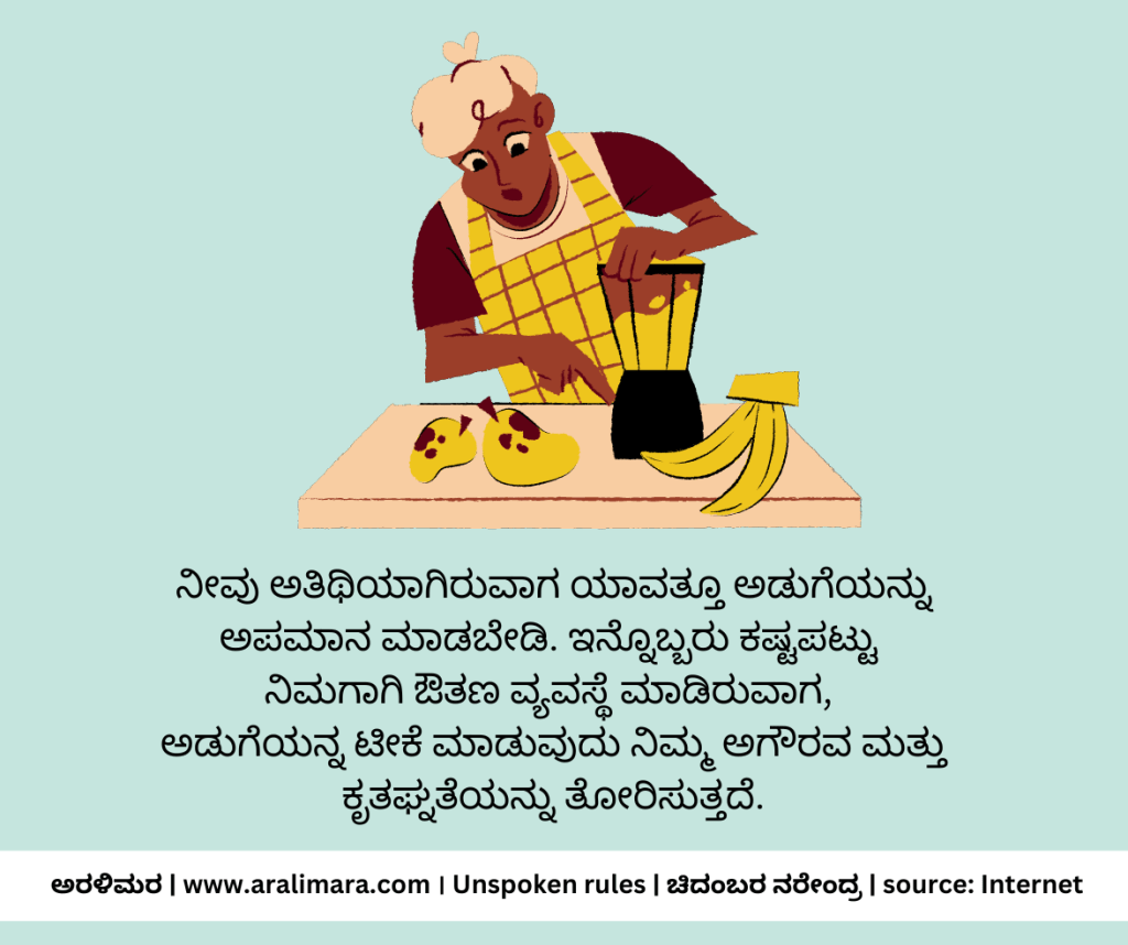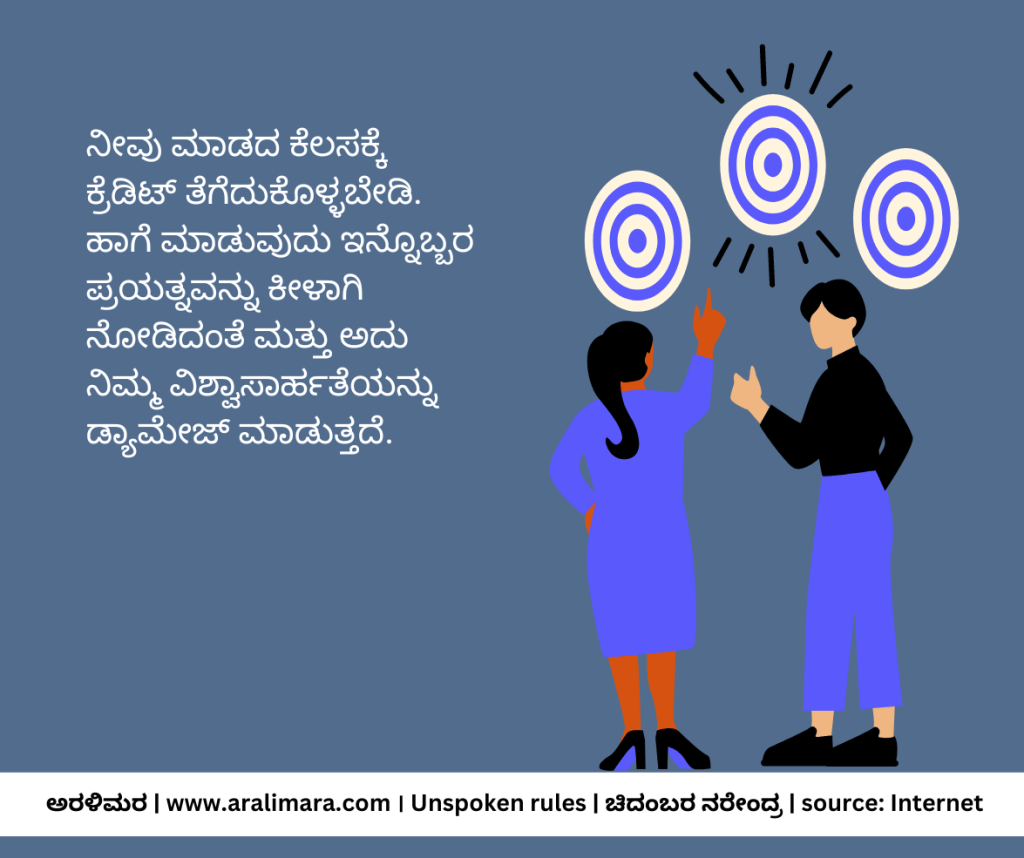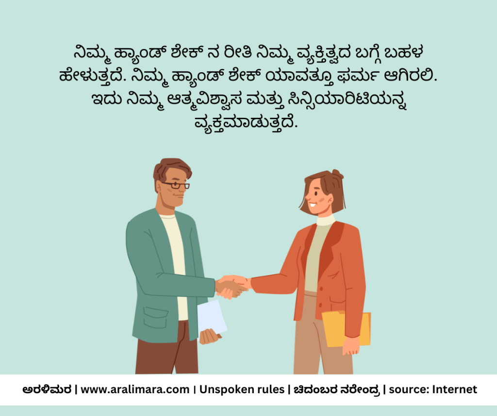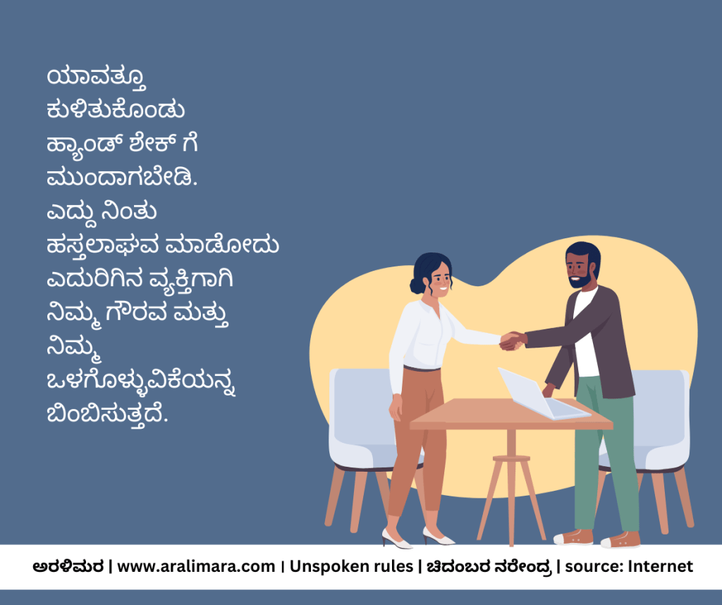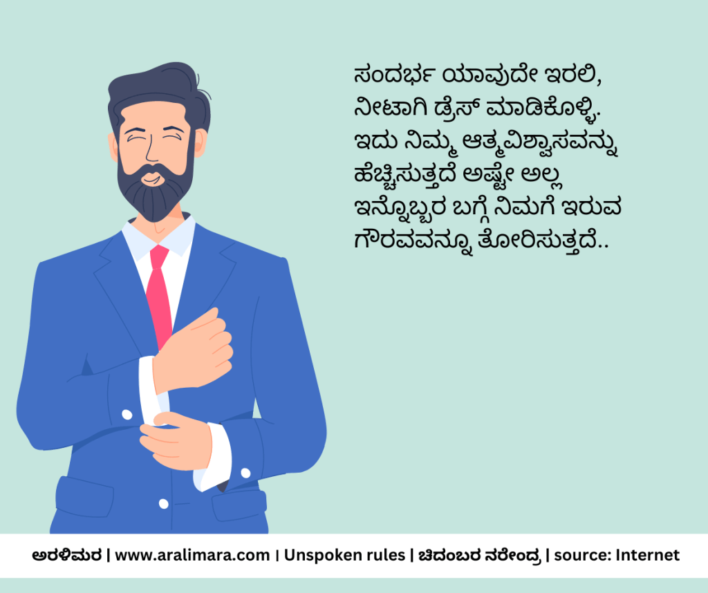 ಸಮಾಜದಲ್ಲಿ ವ್ಯವಹರಿಸುವಾಗ ಕೆಲವು ನಿಯಮಗಳನ್ನು ಪಾಲಿಸಲೇಬೇಕಾಗುತ್ತದೆ. ಅವು ನಮ್ಮ ವ್ಯಕ್ತಿತ್ವವನ್ನು ನಿರೂಪಿಸುವ ಚಿಕ್ಕಚಿಕ್ಕ ಸಂಗತಿಗಳು. ಅಂತಹ 11 ನಿಯಮಗಳು ಇಲ್ಲಿವೆ… | ಸಂಗ್ರಹ ಮತ್ತು ಅನುವಾದ: ಚಿದಂಬರ ನರೇಂದ್ರ