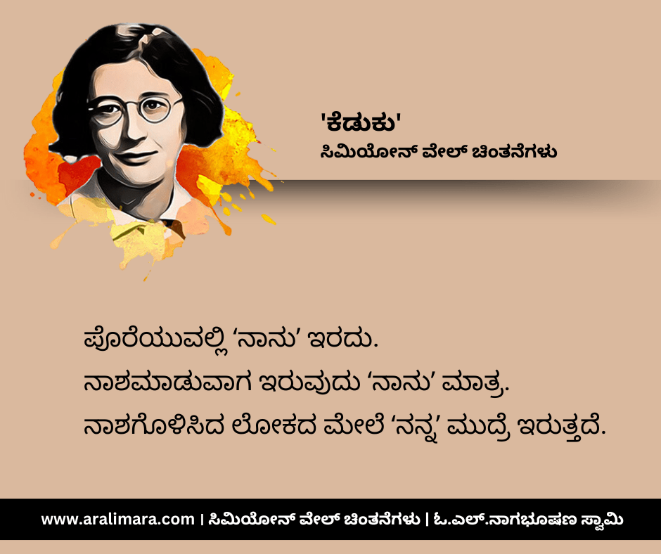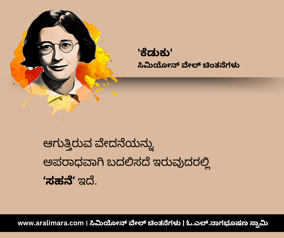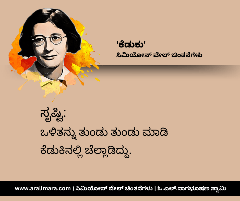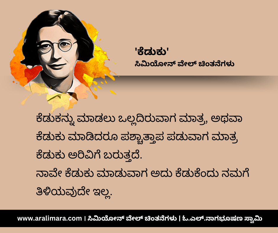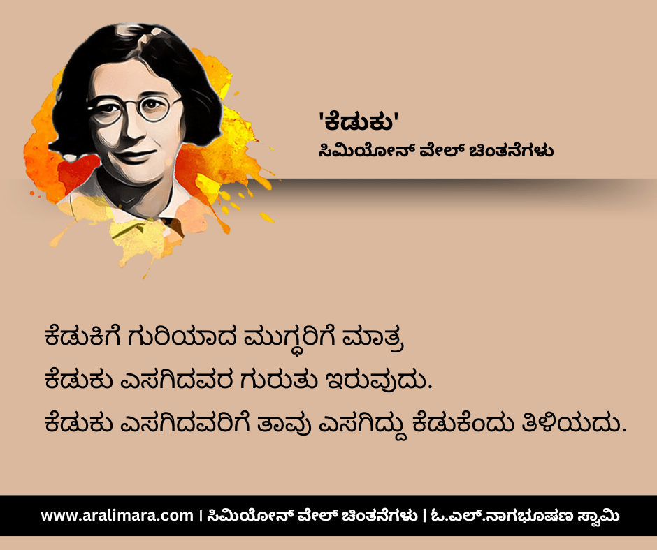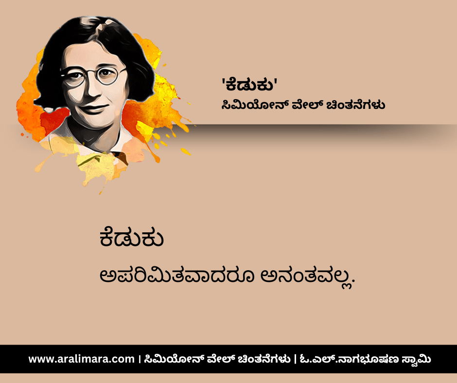 ಸಿಮಿಯೋನ್ ವೇಲ್ ಬರೆದ ಗ್ರಾವಿಟಿ ಅಂಡ್ ಗ್ರೇಸ್ (೧೯೪೭) ಪುಸ್ತಕದಿಂದ ಆಯ್ದ, ‘ಕೆಡುಕು’ ಕುರಿತಾದ ಕೆಲವು ಸೂಕ್ತಿಗಳು ಇಲ್ಲಿವೆ. ಸಂಗ್ರಹ ಮತ್ತು ಅನುವಾದ: ಓ.ಎಲ್.ನಾಗಭೂಷಣ ಸ್ವಾಮಿ.