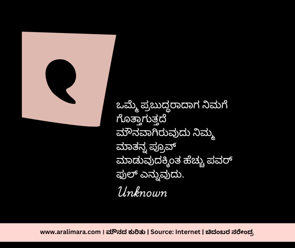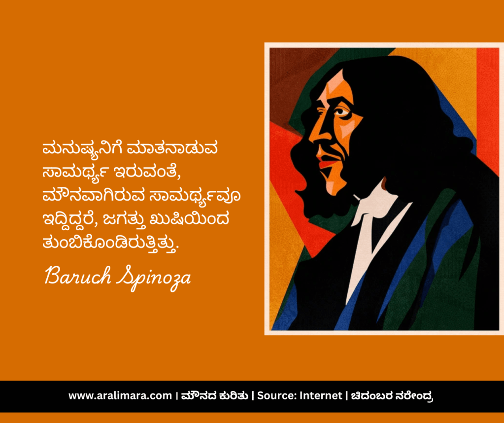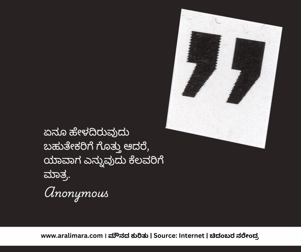 ಮಾತು ಬೆಳ್ಳಿ, ಮೌನ ಬಂಗಾರ ಅನ್ನುವ ಗಾದೆ ಮಾತು ನಮ್ಮೆಲ್ಲರಿಗೂ ಗೊತ್ತೇ ಇದೆ. ಬಹುಶಃ ಮಾತು ಆರಂಭಗೊಂಡ ದಿನದಿಂದಲೇ ಮೌನದ ಮಹತ್ವದ ಬಗ್ಗೆ ಪ್ರಾಜ್ಞರು ಚಿಂತಿಸಿದ್ದಿರಬೇಕು. ಹಾಗೆಂದೇ ಎಲ್ಲ ದೇಶಕಾಲಗಳಲ್ಲೂ ಮೌನದ ಬಗ್ಗೆ ತಿಳಿವಿನ ಹೊಳಹುಗಳು ಹೊಮ್ಮಿವೆ. ಅಂಥ ಕೆಲವು ಚಿಂತನೆಗಳು ನಿಮಗಾಗಿ… । ಸಂಗ್ರಹ ಮತ್ತು ಅನುವಾದ: ಚಿದಂಬರ ನರೇಂದ್ರ