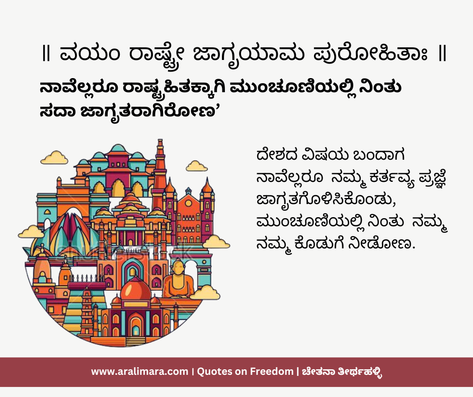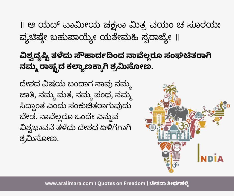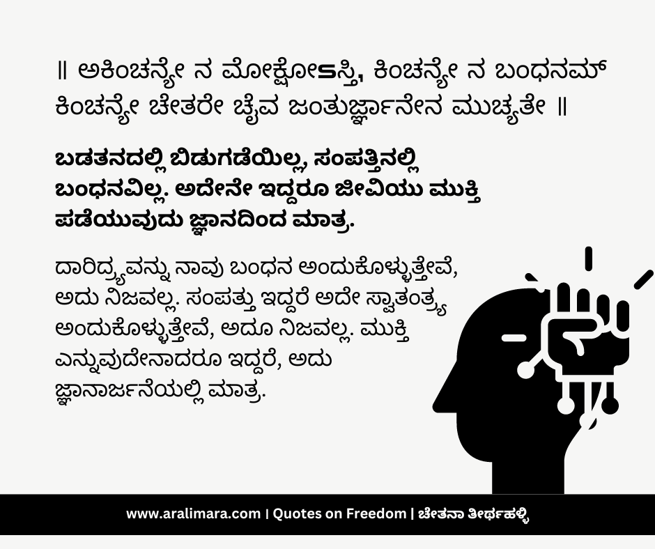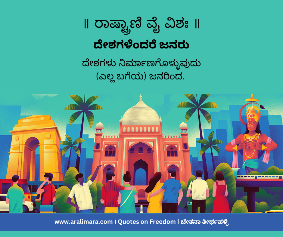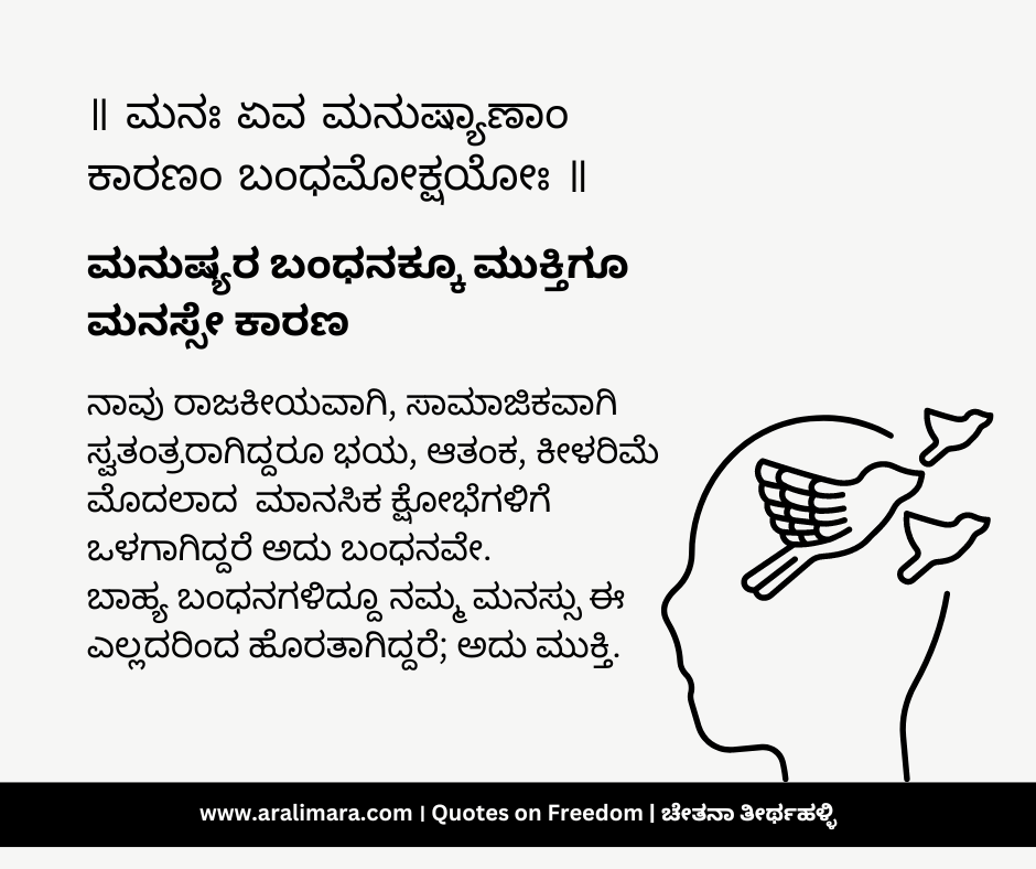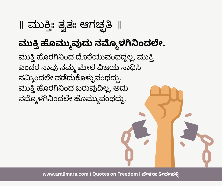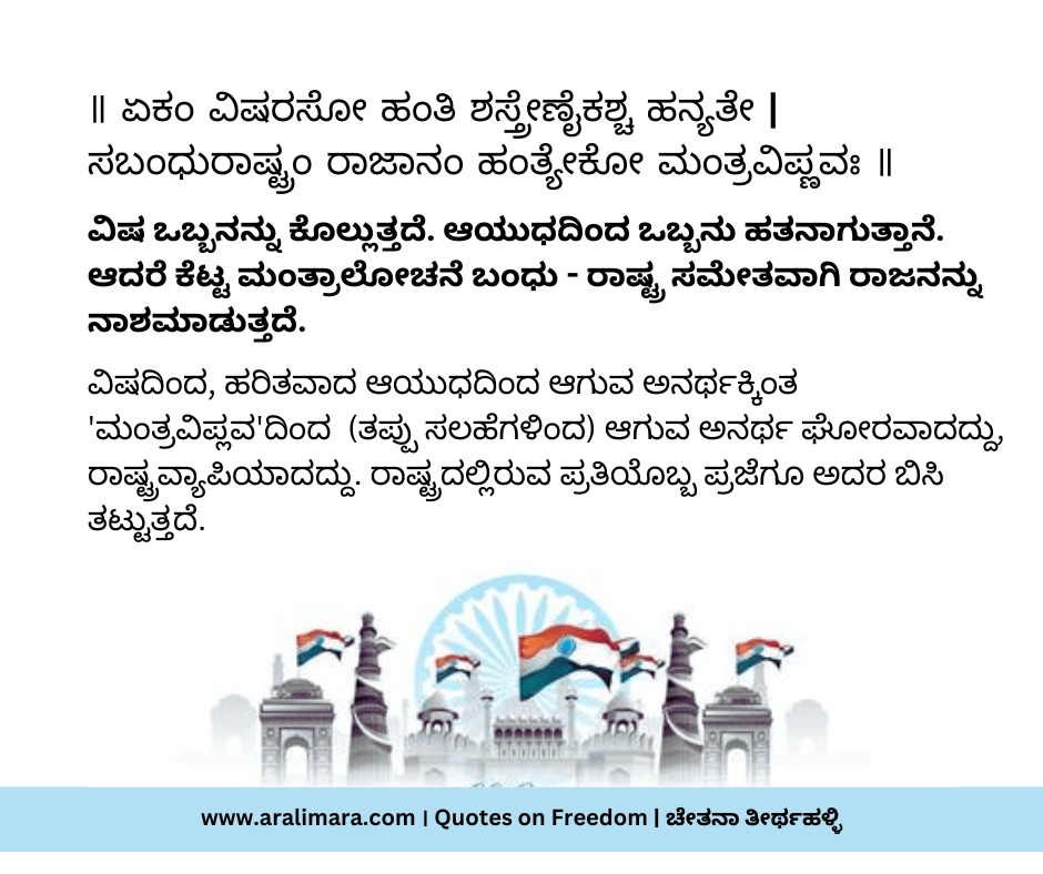 ಮುಕ್ತಿ, ಸ್ವಾತಂತ್ರ್ಯ, ಬಿಡುಗಡೆ ಎಲ್ಲವೂ ಬೇರೆ ಬೇರೆ ಅರ್ಥ ಹೊಮ್ಮಿಸುವ ಪದಗಳಾದರೂ ನಾವು ಎಲ್ಲವನ್ನೂ Freedom ಪದಕ್ಕೆ ಪರ್ಯಾಯವಾಗಿ ಬಳಸುವಂಥವು. ಈ ನಿಟ್ಟಿನಲ್ಲಿ ನಿಜವಾದ ಫ್ರೀಡಂ ಯಾವುದು ಅನ್ನುವುದನ್ನು ಇಲ್ಲಿರುವ ಸುಭಾಷಿತಗಳು ಹೇಳುತ್ತವೆ. ಹಾಗೆಯೇ, ದೇಶದ ಬಗ್ಗೆ, ಆಡಳಿತದ ಬಗೆಗೂ ಒಂದೆರಡು ಸೂಕ್ತಿಗಳಿವೆ. । ಸಂಗ್ರಹ ಮತ್ತು ಅನುವಾದ: ಚೇತನಾ ತೀರ್ಥಹಳ್ಳಿ
