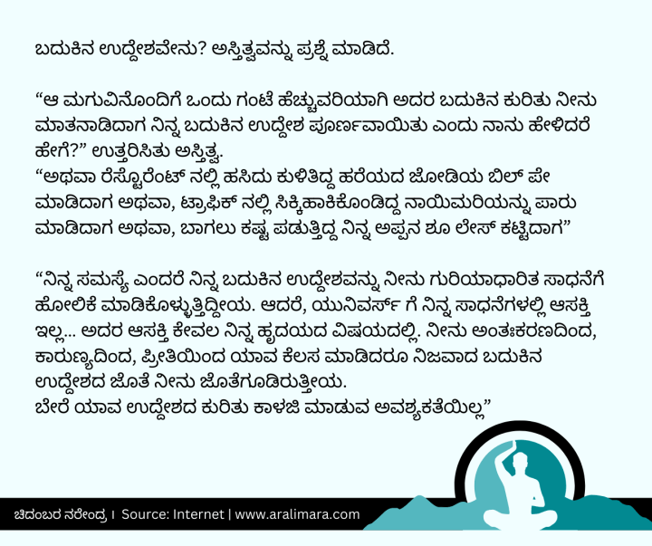 ಬಹುತೇಕರಿಗೆ ಒಂದಲ್ಲ ಒಂದು ಸಲವಾದರೂ ತಮ್ಮ ಬದುಕಿನ ಉದ್ದೇಶವೇನು ಅನ್ನುವ ಪ್ರಶ್ನೆ, ಅದನ್ನು ತಿಳಿಯುವ ಕುತೂಹಲ ಮೂಡಿರುತ್ತದೆ. ಮತ್ತು ಬಹುತೇಕರು ಅದಕ್ಕೆ ಗನವಾದ ಉತ್ತರವನ್ನೇ ನಿರೀಕ್ಷಿಸುತ್ತಾರೆ. ಆದರೆ ಬದುಕಿನ ಉದ್ದೇಶ ಪೂರ್ಣಗೊಳ್ಳುವುದು ನಮ್ಮ ದೈನಂದಿನ ಬದುಕಿನ ಚಿಕ್ಕಚಿಕ್ಕ ಸಂಗತಿಗಳಲ್ಲಿ… । ಸಂಗ್ರಹ ಮತ್ತು ಅನುವಾದ: ಚಿದಂಬರ ನರೇಂದ್ರ