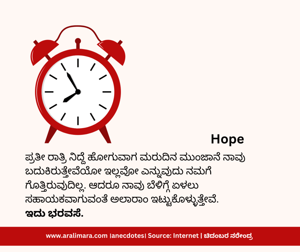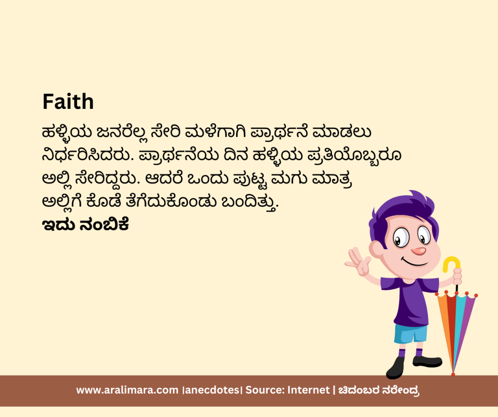 ನಂಬಿಕೆ, ವಿಶ್ವಾಸ, ಭರವಸೆ, ಆತ್ಮವಿಶ್ವಾಸ, ಪ್ರೀತಿ ಮತ್ತು ಧನಾತ್ಮಕ ಮನೋಭಾವ ಬದುಕಿಗೆ ಅತ್ಯಂತ ಅವಶ್ಯಕ. ಇವನ್ನು ಕುರಿತ 6 ದೃಷ್ಟಾಂತ ಕತೆಗಳು ಇಲ್ಲಿವೆ. ಓದಿ, ರೂಢಿಸಿಕೊಳ್ಳಿ, ಬೆಳೆಸಿಕೊಳ್ಳಿ, ಖುಶಿಯಾಗಿ ಬದುಕಿ. । ಸಂಗ್ರಹ ಮತ್ತು ಅನುವಾದ: ಚಿದಂಬರ ನರೇಂದ್ರ