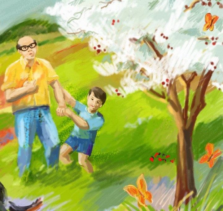 ಮೊಮ್ಮಗ ಅವಸರದಿಂದ ಓಡಿ ಚಿಟ್ಟೆಯನ್ನು ಹಿಡಿಯಲು ಹೋದ. ಅವನು ಚಿಟ್ಟೆಯನ್ನು ಮುಟ್ಟುತ್ತಿದ್ದಂತೆಯೇ ಅದು ಹಾರಿ ಹೋಗಿ ಇನ್ನೊಂದು ಹೂವಿನ ಮೇಲೆ ಕುಳಿತುಕೊಂಡಿತು. ಹುಡುಗ ಓಡಿ ಮತ್ತೆ ಚಿಟ್ಟೆಯ ಹತ್ತಿರ ಹೋದ, ಚಿಟ್ಟೆ ಮತ್ತೆ ಹಾರಿ ಹೋಯಿತು. ಹುಡುಗ ಚಿಟ್ಟೆ ಹಿಡಿಯಲು ಇಡೀ ಗಾರ್ಡನ್ ಓಡಾಡಿದ, ಆದರೆ ಆ ಚಿಟ್ಟೆ ಅವನ ಕೈಗೆ ಸಿಗಲೇ ಇಲ್ಲ. ಕೊನೆಗೊಮ್ಮೆ ಚಿಟ್ಟೆ ಕಣ್ಣಿಗೆ ಕಾಣಿಸದಂತೆ ಮಾಯವಾಯಿತು. ದಣಿದ ಹುಡುಗ ಏದುಸಿರು ಬಿಡುತ್ತ ಅಜ್ಜನ ಹತ್ತಿರ ಬಂದ, “ ಅದು ಹಾರಿ ಹೋಯಿತು ಅಜ್ಜ” ಮುಖ ಕೆಳಗೆ ಹಾಕಿಕೊಂಡು ನಿಂತ.