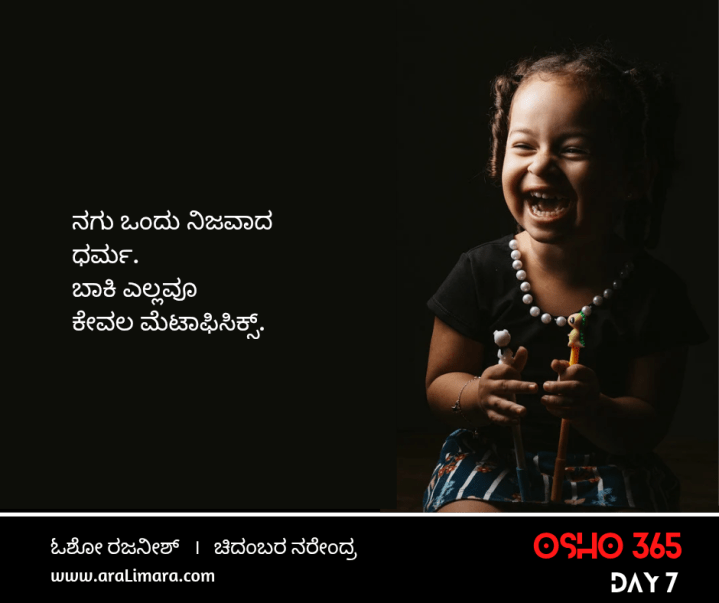 ಯಾರನ್ನೋ ಖುಷಿಪಡಿಸಲು ನೀವು ನಗಬಾರದು, ಏಕೆಂದರೆ ನೀವು ಖುಷಿಯಾಗಿರದ ಹೊರತು ಇನ್ನೊಬ್ಬರನ್ನು ಖುಶಿಪಡಿಸುವುದು ನಿಮಗೆ ಸಾಧ್ಯವಿಲ್ಲ. ನೀವು ಸುಮ್ಮನೇ ಮನಸ್ಸು ಬಿಚ್ಚಿ ನಿಮಗಾಗಿ ನಗಬೇಕು, ನಗಲು ಯಾವ ಕಾರಣಗಳಿಗೂ ಕಾಯಬಾರದು. ಯಾವುದೇ ಸಂಗತಿಯನ್ನು ಸೂಕ್ಷ್ಮವಾಗಿ ಗಮನಿಸುವಿರಾದರೆ, ನೀವು ನಗುವುದನ್ನು ನಿಲ್ಲಿಸುವುದೇ ಇಲ್ಲ. ಎಲ್ಲವೂ, ನಗಲು ಪರಿಪೂರ್ಣ, ನಗಲು ಯಾವ ಕೊರತೆಯೂ ಇಲ್ಲ, ಆದರೆ ನಾವು ನಗುವಿಗೆ ನಮ್ಮ ಮೂಲಕ ಅನುವು ಮಾಡಿಕೊಡುತ್ತಿಲ್ಲ. ನಗುವಿನ ವಿಷಯದಲ್ಲಿ, ಪ್ರೀತಿಯ ವಿಷಯದಲ್ಲಿ, ಬದುಕುವ ವಿಷಯದಲ್ಲಿ ನಾವು ಬಹಳ ಜಿಪುಣರಾಗಿದ್ದೇವೆ. ಈ ಜಿಪುಣತನವನ್ನು ಬಿಟ್ಟುಬಿಡುವುದು ಸಾಧ್ಯ ಎನ್ನುವುದು ನಿಮಗೆ ಮನವರಿಕೆಯಾಗಿಬಿಟ್ಟರೆ, ನೀವು ಒಂದು ಹೊಸ ಆಯಾಮವನ್ನು ಪ್ರವೇಶ ಮಾಡುತ್ತೀರ. ನಗು ಒಂದು ನಿಜವಾದ ಧರ್ಮ, ಬಾಕಿ ಎಲ್ಲವೂ ಕೇವಲ ಮೆಟಾಫಿಸಿಕ್ಸ್.