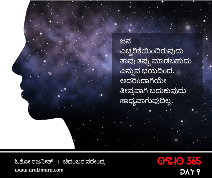 ಪ್ರಜ್ಞೆ ಇರಲಿ ಆದರೆ ಎಚ್ಚರಿಕೆ ಬೇಡ. ಈ ಎರಡರ ನಡುವೆ ಸೂಕ್ಷ್ಮವಾದ ವ್ಯತ್ಯಾಸ ಇದೆ. ಎಚ್ಚರಿಕೆಯ ಬೇರು ಭಯದಲ್ಲಿದೆ ಆದರೆ ಪ್ರಜ್ಞೆಯ ವಿಷಯದಲ್ಲಿ ಹಾಗಲ್ಲ. ಜನ ಎಚ್ಚರಿಕೆಯಿಂದಿರುವುದು ತಾವು ತಪ್ಪು ಮಾಡಬಹುದು ಎನ್ನುವ ಭಯದಿಂದ, ಹಾಗಾಗಿ ಅವರು ಬಹಳ ತೀವ್ರವಾಗಿ ಬದುಕುವುದು ಸಾಧ್ಯವಾಗುವುದಿಲ್ಲ. ಈ ಹೆದರಿಕೆಯೇ ನಿಮಗೆ ಹೊಸ ಜೀವನ ವಿಧಾನ, ನಿಮ್ಮ ಸಾಮರ್ಥ್ಯಕ್ಕೆ ಹೊಸ ದಾರಿ, ಹೊಸ ದಿಕ್ಕು, ಹೊಸ ಜಾಗ ಗಳನ್ನು ಕಂಡುಕೊಳ್ಳಲು ಅವಕಾಶ ಮಾಡಿಕೊಡುವುದಿಲ್ಲ. ನೀವು ಮತ್ತೆ ಮತ್ತೆ ಅದೇ ಹಳೆಯ ಹಾದಿ ತುಳಿಯುತ್ತೀರಿ, ಅದೇ ದಾರಿಯಲ್ಲಿ ಹಿಂದೆ ಮುಂದೆ ಓಡಾಡುತ್ತೀರಿ, ಗೂಡ್ಸ್ ರೈಲುಗಾಡಿಯಂತೆ.