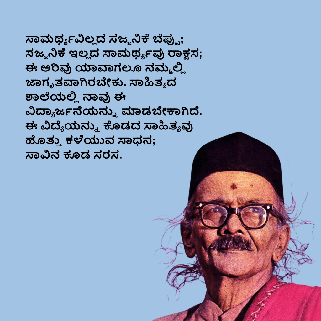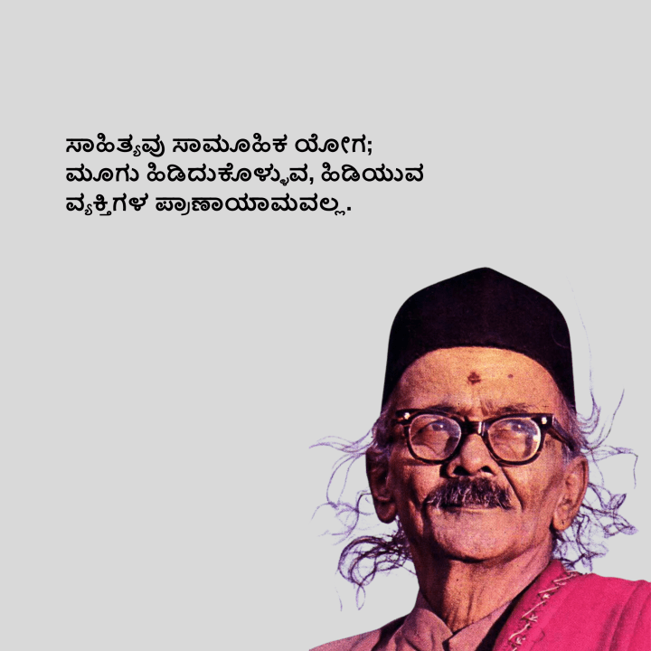 ಸಾಹಿತ್ಯದ ಕುರುಕ್ಷೇತ್ರವು ಶಾಲೆಯಷ್ಟೇ ಅಲ್ಲ, ಮನೆಯಲ್ಲಿ ಸೇರಿ, ಮಠದಲ್ಲಿ ನುಗ್ಗಿ, ಸಮಾಜವನ್ನು ಕಟ್ಟಿ, ಸರ್ಕಾರದಲ್ಲಿ ಪ್ರತಿಷ್ಠೆ ಹೊಂದಬೇಕು. ಯಾಕೆಂದರೆ, ಜೀವನದ ಒಂದು ಸಿದ್ಧಿ ಸಾಹಿತ್ಯದಲ್ಲಿದ್ದಂತೆ ಸಾಹಿತ್ಯದ ಒಂದು ಸಿದ್ಧಿ ಜೀವನದಲ್ಲಿದೆ. ಎಲ್ಲೆಲ್ಲಿಯೂ ಹಾಗೆ ನೋಡಿದರೆ ಧರ್ಮಯುದ್ಧ, ಹೀಗೆ ನೋಡಿದರೆ ರಾಸಲೀಲೆ ನಡೆಯಬೇಕು. ರುದ್ರನ ತಾಂಡವದೊಂದಿಗೆ ಪಾರ್ವತಿಯ ಲಾಸ್ಯವಾಗಬೇಕು. ಈ ಇಮ್ಮುಖದ ಬಾಳನ್ನು ಒಮ್ಮುಖವಾಗಿ ಹವಣಾಗಿ ಕುಣಿಸುವ ತಂತ್ರವನ್ನು ಸಾಹಿತ್ಯದ ವಿರಾಟ್ ಕಲೆಯೇ ತೋರಿಸೀತು.