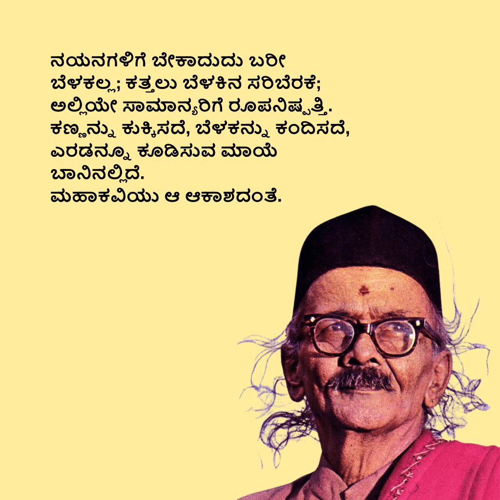 ಬ್ರಹ್ಮನು ಬ್ರಹ್ಮಾಂಡಗಳನ್ನು ಪಡೆದು ಅಂತರೀಕ್ಷವನ್ನು ಹೇಗೋ ಸೂರೆ ಮಾಡಿದ್ದಾನೆ. ಸರಸ್ವತಿಯು ಅವುಗಳಿಗೆ ಸೂತ್ರ ಕಲ್ಪಿಸಿ ಮಾಲೆ ಮಾಡಿ ತನ್ನ ಧ್ಯಾನದ ಗತಿಯಲ್ಲಿ ಜಗಚ್ಚಕ್ರವನ್ನು ತಿರುಗಿಸುತ್ತಿದ್ದಾಳೆ. ಅದೇಕೆ?, ತನ್ನ ಶರಣರಲ್ಲಿ ಲೇಸನ್ನು ಪ್ರೇರೇಪಿಸಲು. ಕವಿಗಳು ಸರಸ್ವತಿಯ ಶರಣರು.ಅವರ ಲೇಸಿನ ಪ್ರೇರಣೆಗೂ ಜಗಚ್ಚಕ್ರದ ಗತಿಗೂ ವಿರೋಧವಿಲ್ಲ. ಎರಡು ಒಂದೇ ಧ್ಯಾನದ ಎರಡು ಅಂಗಗಳು. ಕಾವ್ಯವು ಲೇಸನ್ನು ಪಡೆಯುವುದು. ಅದು ಲೇಸಿಗಾಗಿದೆ. ಕಾವ್ಯದಿಂದ ಭಯವಾಗುವ ಕಾರಣವಿಲ್ಲ. ಕನ್ನಡದ ಲೇಸಾಗಲಿ ಕಾವ್ಯದಿಂದ. ಅಂಥ ಕಾವ್ಯ ಬೆಳೆಯುವಂತೆ ಸರಸ್ವತಿಯು ಈ ಕ್ಷೇತ್ರದಲ್ಲಿ ರದವೃಷ್ಟಿಯನ್ನು ಮಾಡಲಿ ಎಂದು ಪ್ರಾರ್ಥಿಸುತ್ತೇನೆ. (ಸಾಹಿತ್ಯದ ವಿರಾಟ್ ಸ್ವರೂಪ)