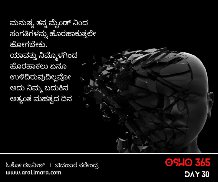 ಯಾವತ್ತು ನಿಮ್ಮೊಳಗಿಂದ ಹೊರಹಾಕಲು ಏನೂ ಉಳಿದಿರುವುದಿಲ್ಲವೋ ಅದು ನಿಮ್ಮ ಬದುಕಿನ ಅತ್ಯಂತ ಮಹತ್ವದ ದಿನ ; ಎಲ್ಲವನ್ನೂ ಈಗಾಗಲೇ ಹೊರಹಾಕಲಾಗಿದೆ, ಈಗ ಉಳಿದುಕೊಂಡಿರುವುದು ಶುದ್ಧ ಖಾಲೀತನ. ಈ ಖಾಲೀತನದಲ್ಲಿಯೇ ನೀವು ನಿಮ್ಮನ್ನು ಕಂಡುಕೊಳ್ಳುತ್ತೀರಿ… ~ ಓಶೋ ರಜನೀಶ್ । ಕನ್ನಡಕ್ಕೆ: ಚಿದಂಬರ ನರೇಂದ್ರ