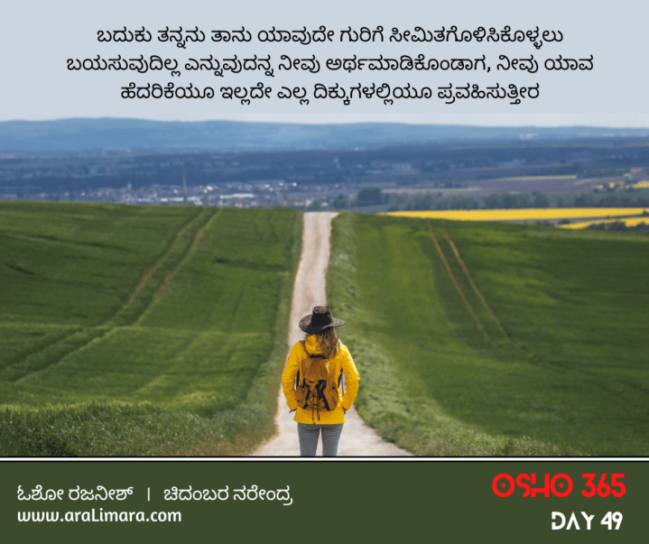 ಬದುಕು ತನ್ನನು ತಾನು ಯಾವುದೇ ಗುರಿಗೆ ಸೀಮಿತಗೊಳಿಸಿಕೊಳ್ಳಲು ಬಯಸುವುದಿಲ್ಲ ಎನ್ನುವುದನ್ನ ನೀವು ಅರ್ಥಮಾಡಿಕೊಂಡಾಗ, ನೀವು ಯಾವ ಹೆದರಿಕೆಯೂ ಇಲ್ಲದೇ ಎಲ್ಲ ದಿಕ್ಕುಗಳಲ್ಲಿಯೂ ಪ್ರವಹಿಸುತ್ತೀರ. ಎಲ್ಲಿ ವೈಫಲ್ಯಕ್ಕೆ ಅವಕಾಶವಿಲ್ಲವೋ ಅಲ್ಲಿ ಗೆಲುವು ಕೂಡ ಸಾಧ್ಯವಿಲ್ಲ. ಆದ್ದರಿಂದಲೇ ನೀವು ಆಗ ಹತಾಶೆಯಿಂದಲೂ ಹೊರತು. ಆಗ ಪ್ರತಿ ಕ್ಷಣ ತನ್ನದೇ ಆದ ವಿಶೇಷತೆಯನ್ನು ಹೊಂದಿರುತ್ತದೆ ; ಹಾಗಂತ ಅದು ಏನನ್ನೋ ಸೂಚಿಸುತ್ತಿದೆ ಅಂತಲ್ಲ, ಅದನ್ನ ಯಾವುದೋ ಒಂದು ಗುರಿಗೆ ಒಂದು means ಆಗಿ ಬಳಸಬೇಕು ಅಂತಲ್ಲ, ಅದಕ್ಕೆ ತನ್ನದೇ ಆದ ಅಂತರ್ಗತ ಮೌಲ್ಯವಿದೆ.