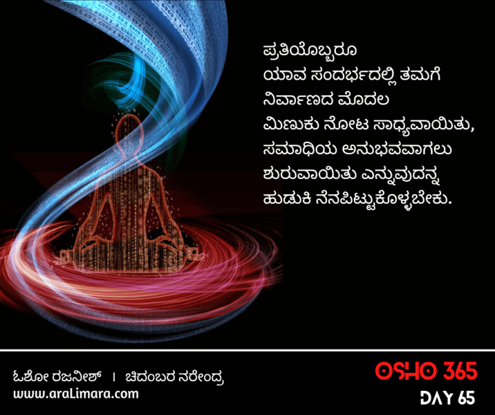 ಬಹಳಷ್ಟು ಬಾರಿ ನಿರ್ವಾಣ, ಬೆಳಕು ಗಳ ಮಿಣುಕು ದರ್ಶನವಾದರೂ ಅವನ್ನು ಹಿಡಿದಿಟ್ಟುಕೊಳ್ಳಲು ಸಾಧ್ಯವಾಗುವುದಿಲ್ಲ. ಇವನ್ನು ಬಹಳಷ್ಟು ಹಿಡಿದಿಟ್ಟುಕೊಳ್ಳಲು ಆಗಲಿಲ್ಲವಲ್ಲ ಎಂದು ಚಿಂತೆ ಮಾಡಬೇಡಿ. ಈ ಎಲ್ಲವನ್ನೂ ಮರೆತುಬಿಡಿ. ಅವು ಸಂಭವಿಸಿದ ಸಂದರ್ಭಗಳನ್ನು ಮಾತ್ರ ನೆನಪಿಟ್ಟುಕೊಳ್ಳಿ ಮತ್ತು ಅದೇ ಸಂದರ್ಭಗಳಲ್ಲಿ ಮತ್ತೆ ಮತ್ತೆ ಪ್ರವೇಶಿಸುವ ಪ್ರಯತ್ನ ಮಾಡಿ ~ ಓಶೋ ರಜನೀಶ್; ಕನ್ನಡಕ್ಕೆ: ಚಿದಂಬರ ನರೇಂದ್ರ