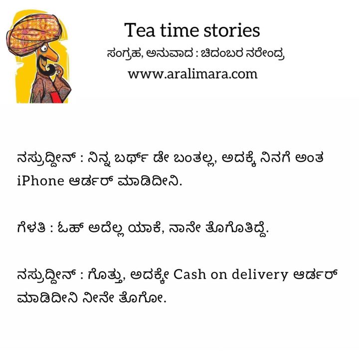 ನಸ್ರುದ್ದೀನನ ಗಿಫ್ಟ್! : Tea time story ಏಪ್ರಿಲ್ 12, 2025 By ಅರಳಿ ಮರ Share this:Tweet Click to email a link to a friend (Opens in new window) Email Click to share on Telegram (Opens in new window) Telegram Click to share on WhatsApp (Opens in new window) WhatsApp ಇನ್ನಷ್ಟು Click to print (Opens in new window) Print Click to share on Reddit (Opens in new window) Reddit Share on TumblrLike ಲೋಡ್ ಆಗುತ್ತಿದೆ... Related About ಅರಳಿ ಮರ ಆಧ್ಯಾತ್ಮ, ವ್ಯಕ್ತಿತ್ವ ವಿಕಸನ ಮತ್ತು ಜೀವನ ಶೈಲಿ