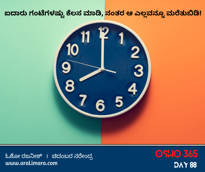 ಜಗತ್ತಿನ ಜೊತೆ ಕೂಡಿ ಕೆಲಸ ಮಾಡಬೇಕು ನಿಜ ಆದರೆ ಅದರಲ್ಲೇ ಕಳೆದು ಹೋಗಿ ಬಿಡಬಾರದು. ಐದಾರು ಗಂಟೆಗಳಷ್ಟು ಕೆಲಸ ಮಾಡಿ, ನಂತರ ಆ ಎಲ್ಲವನ್ನೂ ಮರೆತುಬಿಡಿ. ನಿಮ್ಮ ಆಂತರಿಕ ಬೆಳವಣಿಗೆಗಾಗಿ ಕನಿಷ್ಟ ಪಕ್ಷ ಎರಡು ಗಂಟೆಗಳನ್ನಾದರೂ ತೆಗೆದಿಡಿ, ಕೆಲವು ಗಂಟೆಗಳು ನಿಮ್ಮ ಸಂಬಂಧಗಳಿಗೆ , ಪ್ರೇಮಕ್ಕೆ, ಮಕ್ಕಳಿಗೆ, ಗೆಳೆಯರಿಗಾಗಿ ಮತ್ತು ಸಮಾಜಕ್ಕೆ ಮೀಸಲಾಗಿರಲಿ ~ ಓಶೋ ರಜನೀಶ್, ಕನ್ನಡಕ್ಕೆ: ಚಿದಂಬರ ನರೇಂದ್ರ
