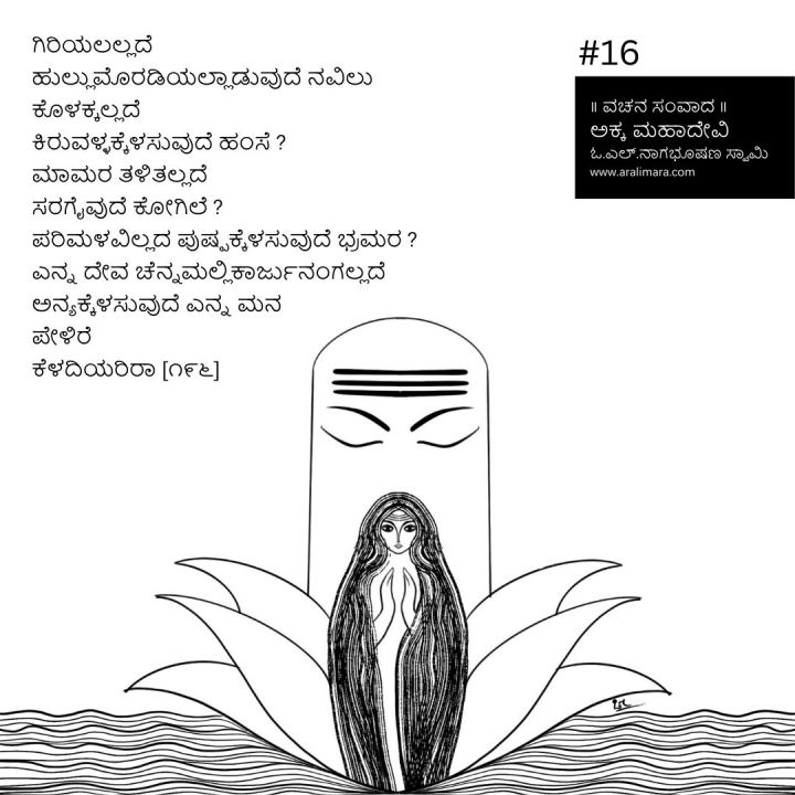 ತಾನು ನವಿಲು, ಹಂಸ, ಕೋಗಿಲೆ; ನನಗೆ ತಕ್ಕ ಗಿರಿ, ಕೊಳ, ಮಾಮರ ಚೆನ್ನಮಲ್ಲಿಕಾರ್ಜುನ. ಮಿಕ್ಕದ್ದೆಲ್ಲ ಹುಲ್ಲಿನ ದಿಬ್ಬ, ಪುಟ್ಟ ಹಳ್ಳ, ಮಾಮೂಲು ಮರ. ಚೆನ್ನಮಲ್ಲಿಕಾರ್ಜುನನಲ್ಲದೆ ಬೇರೆ ಏನನನ್ನೂ ಮನಸ್ಸು ಬಯಸದು ಎಂದು ಗೆಳತಿಯರ ಹತ್ತಿರ ಹೇಳಿಕೊಳ್ಳುತ್ತಿರುವ ಮಾತು… । ~ಓ.ಎಲ್.ನಾಗಭೂಷಣ ಸ್ವಾಮಿ । ವಚನ ಸಂವಾದ : ಅಕ್ಕ ಮಹಾದೇವಿ : ಭಾಗ ೧ ಸಂದೇಹ, ಪ್ರಶ್ನೆ