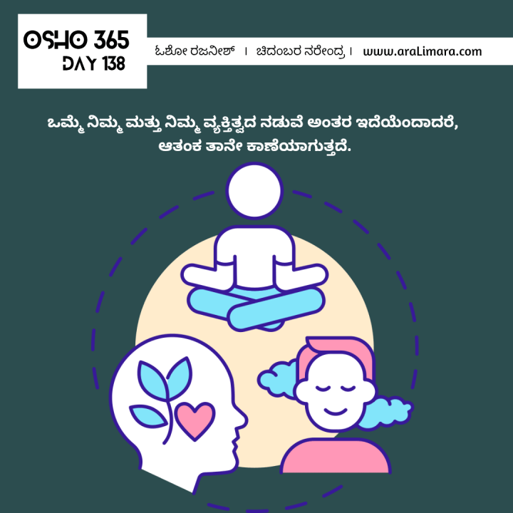 ಒಮ್ಮೆ ನಿಮ್ಮ ಮತ್ತು ನಿಮ್ಮ ವ್ಯಕ್ತಿತ್ವದ ನಡುವೆ ಅಂತರ ಇದೆಯೆಂದಾದರೆ, ಆತಂಕ ತಾನೇ ಕಾಣೆಯಾಗುತ್ತದೆ. ಯಾವಾಗ ಅಂತರ ಮರೆಯಾಗುತ್ತದೆಯೋ, ಯಾವಾಗ ನೀವು ಮತ್ತೇ ನಿಮ್ಮ ವ್ಯಕ್ತಿತ್ವಕ್ಕೆ ಹತ್ತಿರವಾಗುತ್ತೀರೋ ಆಗ ಆತಂಕ ಮತ್ತೆ ಕಾಣಿಸಿಕೊಳ್ಳುತ್ತದೆ. ಆತಂಕ, ನಿಮ್ಮ ವ್ಯಕ್ತಿತ್ವದ ಸಮಸ್ಯೆಗಳೊಂದಿಗೆ ತನ್ನನ್ನು ತಾನು ಗುರುತಿಸಿಕೊಳ್ಳುತ್ತಿದೆ. ಪ್ರಶಾಂತತೆ ಇಲ್ಲಿ ಹಸ್ತಕ್ಷೇಪ ಮಾಡುತ್ತಿಲ್ಲ, ಅದು ನಿಮ್ಮ ವ್ಯಕ್ತಿತ್ವದ ಸಮಸ್ಯೆಗಳೊಂದಿಗೆ ತನ್ನನ್ನು ತಾನು ಗುರುತಿಸಿಕೊಳ್ಳುತ್ತಿಲ್ಲ.