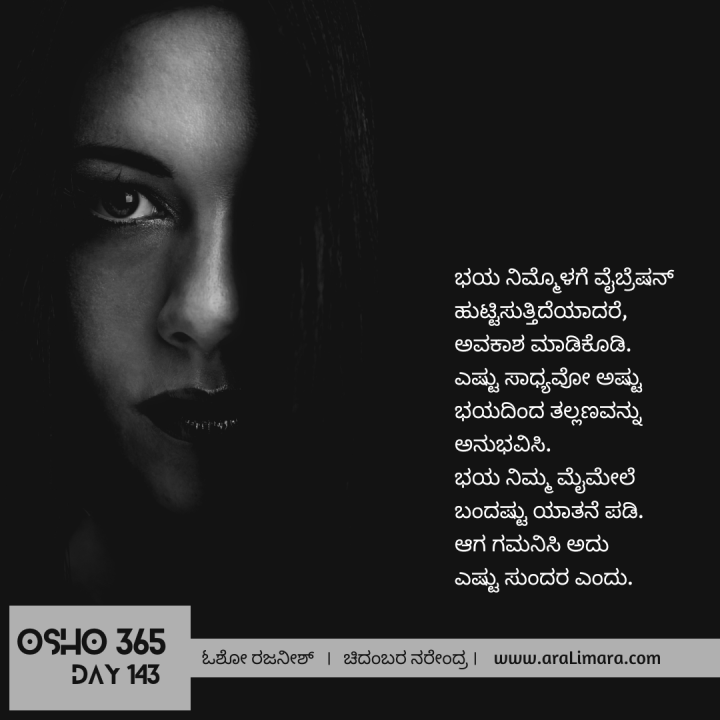 ನಿಮ್ಮೊಳಗೆ ಇನ್ನೂ ಭಯ ಇರುವುದಾದರೆ, ಅದಕ್ಕೆ ನಿಮ್ಮನ್ನು ಆವರಿಸಿಕೊಳ್ಳಲು ಅವಕಾಶ ಮಾಡಿಕೊಡಿ. Infact ನೀವು ಇದನ್ನು ಆನಂದಿಸಿ. ಅದು ಇರಲಿ ನಿಮ್ಮೊಳಗೆ, ನಡುಗಲು ಶುರುಮಾಡಿ. ಭಯ ನಿಮ್ಮೊಳಗೆ ವೈಬ್ರೆಷನ್ ಹುಟ್ಟಿಸುತ್ತಿದೆಯಾದರೆ, ಅವಕಾಶ ಮಾಡಿಕೊಡಿ. ಎಷ್ಟು ಸಾಧ್ಯವೋ ಅಷ್ಟು ಭಯದಿಂದ ತಲ್ಲಣವನ್ನು ಅನುಭವಿಸಿ. ಭಯ ನಿಮ್ಮ ಮೈಮೇಲೆ ಬಂದಷ್ಟು ಯಾತನೆ ಪಡಿ. ಆಗ ಗಮನಿಸಿ ಅದು ಎಷ್ಟು ಸುಂದರ ಎಂದು. ಇದು ಒಂದು ಅಮೋಘ ಸ್ನಾನದ ಹಾಗೆ, ನಿಮ್ಮ ಮೇಲಿನ ಎಲ್ಲ ಧೂಳೂ ತೊಳೆಯಲ್ಪಟ್ಟಿದೆ. ಈ ಕಂಪನದಿಂದ ನೀವು ಹೊರಬಂದಾಗ, ನಿಮಗೆ ಹೆಚ್ಚು ಜೀವಂತಿಕೆಯ ಅನುಭವವಾಗುವುದು, ನಿಮ್ಮ ಕಣ ಕಣವೂ ಹೊಸ ಉತ್ಸಾಹದಿಂದ, ಹೊಸ ಜೀವಕಳೆಯಿಂದ ನಳನಳಿಸುವುದು, ಹೊಸ ಶಕ್ತಿಯೊಂದಿಗೆ, ಹಳೆಯ ಎಲ್ಲ ಕೊಳೆಯನ್ನು ಕಳೆದುಕೊಂಡು.