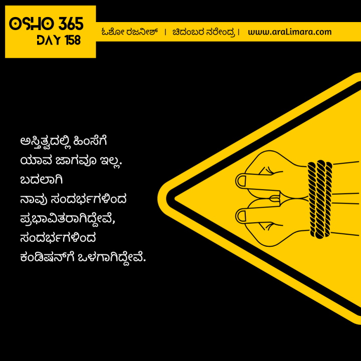 ನಿಮ್ಮ ಅಸ್ತಿತ್ವದಲ್ಲಿ ಹಿಂಸೆಗೆ ಯಾವ ಜಾಗವೂ ಇಲ್ಲ. ಬದಲಾಗಿ ನಾವು ಸಂದರ್ಭಗಳಿಂದ ಪ್ರಭಾವಿತರಾಗಿದ್ದೇವೆ, ಸಂದರ್ಭಗಳಿಂದ ಕಂಡಿಷನ್ ಗೆ ಒಳಗಾಗಿದ್ದೇವೆ. ಬದುಕಿನಲ್ಲಿ ಹಲವಾರು ಸಂಗತಿಗಳಿಂದ ನಮ್ಮನ್ನು ನಾವು ರಕ್ಷಿಸಕೊಳ್ಳಬೇಕಿದೆ ಮತ್ತು ನಾವು ಆಕ್ರಮಣವನ್ನು ರಕ್ಷಣೆಯ ಅತ್ಯುತ್ತಮ ಮಾರ್ಗ ಎಂದುಕೊಂಡಿದ್ದೇವೆ. ಯಾವಾಗ ಒಬ್ಬ ವ್ಯಕ್ತಿ ತನ್ನನ್ನು ಬಹಳಷ್ಟು ಬಾರಿ ರಕ್ಷಿಸಿಕೊಳ್ಳಬೇಕಾದ ಸಂದರ್ಭಗಳನ್ನು ಎದುರುಗೊಳ್ಳುತ್ತಾನೋ ಆಗ ಆ ವ್ಯಕ್ತಿ ಆಕ್ರಮಣಶೀಲನಾಗಿ ರೂಪಗೊಳ್ಳುತ್ತಾನೆ, ಹಿಂಸಾವಾದಿಯಾಗುತ್ತಾನೆ. ಏಕೆಂದರೆ ನಾವು ಹಿಂಸೆಗೊಳಗಾಗುವ ಮೊದಲು ನಾವೇ ಹಿಂಸೆಗೆ ಮುಂದಾಗುವುದು ಒಳ್ಳೆಯದು ಎಂದು ಅವನು ತಿಳಿದುಕೊಳ್ಳುತ್ತಾನೆ. ಯಾರು ಮೊದಲು ಆಕ್ರಮಣ ಮಾಡುತ್ತಾರೋ ಅವರಿಗೆ ಗೆಲ್ಲುವ ಅವಕಾಶಗಳು ಜಾಸ್ತಿ ಎನ್ನುವುದು ಅವನ ವಾದವಾಗುತ್ತದೆ.