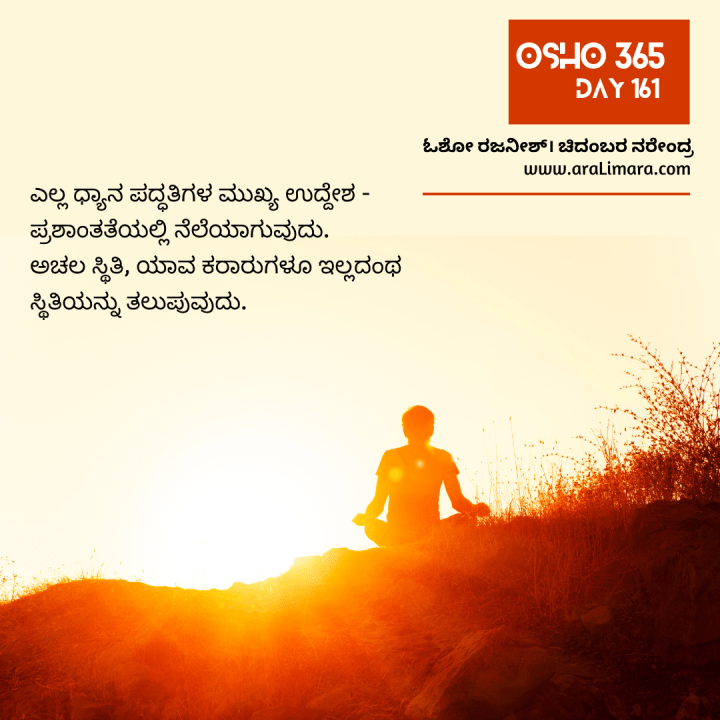 ಇದು ಎಲ್ಲ ಧ್ಯಾನ ಪದ್ಧತಿಗಳ ಮುಖ್ಯ ಉದ್ದೇಶ – ಇಂಥ ಪ್ರಶಾಂತತೆಯಲ್ಲಿ ನೆಲೆಯಾಗುವುದು, ಇಂಥ ಅಚಲ ಸ್ಥಿತಿ, ಯಾವ ಕರಾರುಗಳೂ ಇಲ್ಲದಂಥ ಸ್ಥಿತಿಯನ್ನು ತಲುಪುವುದು. ಆ ನಂತರ ಪರಿಸ್ಥಿತಿ ಏನೇ ಆಗಲಿ, ನೀವು ಖುಶಿಯಲ್ಲಿಯೇ ಇರುತ್ತೀರಾ. ಸಾಮಾನ್ಯ ಖುಶಿಯಲ್ಲ ಪ್ರಚಂಡ ಖುಶಿ. ಆಗ ನಿಮ್ಮನ್ನು ಹಿಂದೆ ಸತಾಯಿಸುತ್ತಿದ್ದ ಸಂಗತಿಗಳು ತಾನೇ ತಾನಾಗಿ ಸಂಭವಿಸಲು ಶುರು ಆಗುತ್ತವೆ. ಥಟ್ಟನೇ ಎಲ್ಲವೂ ಸರಾಗವಾಗುತ್ತವೆ, ಎಲ್ಲವೂ ನಿಮ್ಮ ಪ್ಲಾನ್ ಲ್ಲಿ ಪಕ್ಕಾ ಫಿಟ್ ಆಗಿ ಕುಳಿತುಕೊಳ್ಳುತ್ತವೆ.