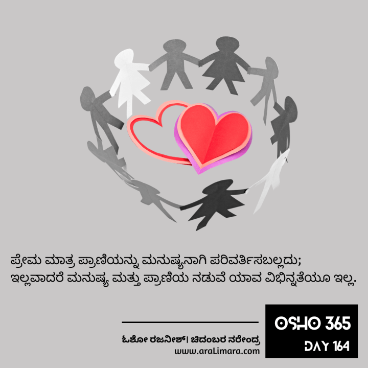 ಪ್ರೇಮ ದಿವ್ಯವಾದದ್ದು. ಈ ಭೂಮಿಯ ಮೇಲೆ ದೈವಿಕವಾದದ್ದು ಏನಾದರೂ ಇದೆ ಎಂದರೆ ಅದು ಪ್ರೇಮ. ಮತ್ತು ಪ್ರೇಮ ಎಲ್ಲವನ್ನೂ ದೈವಿಕವಾಗಿಸುತ್ತದೆ. ಪ್ರೇಮ, ಬದುಕಿನ ನಿಜವಾದ ರಸವಿದ್ಯೆ, ಏಕೆಂದರೆ ಸಾಮಾನ್ಯ ಲೋಹವನ್ನೂ ಪ್ರೇಮ ಬಂಗಾರವಾಗಿಸುತ್ತದೆ ~ ಓಶೋ ರಜನೀಶ್; ಕನ್ನಡಕ್ಕೆ: ಚಿದಂಬರ ನರೇಂದ್ರ
