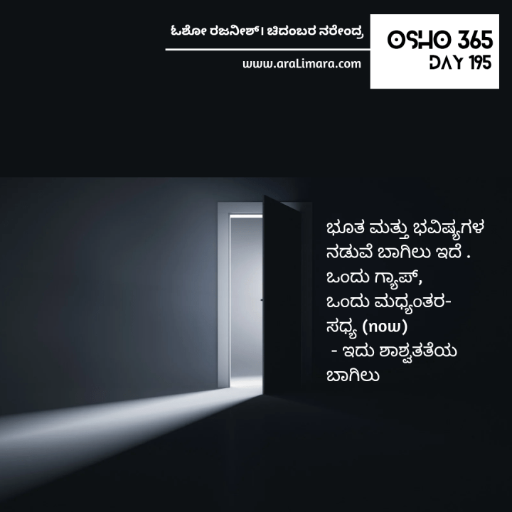 ಹಾಗಾಗಿ ಭೂತ ಮತ್ತು ಭವಿಷ್ಯಗಳ ನಡುವೆ ಬಾಗಿಲು ಇದೆ , ಒಂದು ಗ್ಯಾಪ್, ಒಂದು ಮಧ್ಯಂತರ- ಸಧ್ಯ (now) – ಇದು ಶಾಶ್ವತತೆಯ ಬಾಗಿಲು. ಕೇವಲ ಶಾಶ್ವತತೆಯಲ್ಲಿ ಮಾತ್ರ ಆನಂದ ಸಾಧ್ಯ. : ಕಾಲದ ಪರಿಧಿಯಲ್ಲಿ ಜಾಸ್ತಿ ಎಂದರೆ ಒಂದಿಷ್ಟು ಸುಖ ಸಾಧ್ಯವಾಗಬಹುದು, ಒಂದಿಷ್ಟು ನೋವು ಸಂಭವಿಸಬಹುದು : ಆದರೆ ಎರಡು ಕೂಡ ಕ್ಷಣಿಕವಾದವು. ಅವುಗಳ ನೇಚರ್ ಬೇರೆ ಅಲ್ಲ. ನೋವು ಬಂದು ಹೋಗುತ್ತದೆ ಹಾಗೆಯೇ ಸುಖ ಕೂಡ. ಅವು ಕ್ಷಣಿಕ, ನೀರಿನ ಗುಳ್ಳೆಗಳ ಹಾಗೆ.